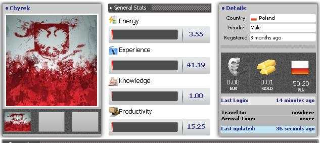 MarketGlory - gra, na której zarabiasz realną gotówkęxeronik opublikował(a) temat w Dzienniki pracy MARKETGLORY jest przeglądarkową grą, społeczno, ekonomiczno, polityczno, wojskową, w której zarobioną wirtualną walutę możesz zamienić na prawdziwe pieniądze.Oczywiście nie uda Ci się to w tydzień czy dwa, ale w dłuższym okresie czasu można mieć z tego niezłe zyski.Jeżeli masz dryg do prowadzenia interesów, potrafisz logicznie myśleć, jesteś wytrwały i masz codziennie chwilę czasu to zapraszam do zapoznania się z opisywaną tutaj symulacją wirtualnego świata. Zarobione pieniądze możesz wypłacić na swoje konto bankowe lub PayPala, albo zainwestować w grze co właściwie przemyślane z pewnością zwiększy Wasze zyski. Każdy gracz w Marketglory może pracować, zakładać własne przedsiębiorstwa, zasiąść w rządzie państwa lub tez zająć się walką i zdobywać coraz to wyższe stopnie wojskowe za które będzie miał płacone zyski z areny. Drogą do sukcesu jest opracowanie własnej strategii rozwoju postaci. W grze nie ma limitu czasu – jedni osiągną swoje cele szybciej, inni później. Ważne jest, aby być w Marketglory obecnym i rozwijać to co daje satysfakcję w grze. Sukces jest tu wynikiem działania, myślenia i wytrwałości. W MarketGlory można: - założyć własną firmę, organizację itp., itd.; - atakować innych graczy (10 razy na dobę); - pracować (raz dziennie); - kupować akcje; - kupować/sprzedawać dobra materialne oraz naszych niewolników/poleconych; - wymieniać waluty na inne oraz wiele innych rzeczy. Nasze zarobki zależą od poziomu produktywności. Na stronie można znaleźć wzory do obliczenia ile zarobimy mając dany poziom tego współczynnika. W ofertach pracy podane są stawki godzinowe dla productivity równego 1000, zatem na początku będziemy zarabiać o wiele mniej gdyż współczynnik ten jest równy 1. Rośnie on po każdej wykonanej pracy, z tego względu, że zależy on od posiadanego przez nas doświadczenia, wiedzy oraz energii. Doświadczenie również wzrasta po każdej pracy. Wiedzę oraz energię możemy zwiększyć kupując różne rzeczy. Dodali nowe udoskonalenie które jest dla mnie bardzo fajne możesz dziennie zyskać nawet 3 punkty expa czyli miesięcznie 90 nie jak kiedyś 0,7 .Do tego potrzeba : mieć 5 aktywnych referrals żeby dostać 3 punkty ex-pa im miej referrals tym mniej punktów otrzymamy Od rządu możemy dostać różne premie: - za każdą wygraną walkę - do 8 PLN (zależne od poziomu naszej energii); - za przepracowane 3 dni pod rząd - do 500 PLN (zależne od naszej produktywności); - za każdego aktywnego poleconego - do 3gold (zależne od poziomu energii poleconego); - bonus za range w arenie(np jak ja mam Novice 4 dostaje codziennie 0.4Euro)na maxa można dostać 6 euro dziennie. Od każdego poleconego pobieramy do 10% jego zarobków Każdego poleconego możemy zablokować za odpowiednią cenę (nie może zostać on wtedy podbity przez innego racza). Po rejestracji z reflinka przez 100 dni jest automatycznie zablokowany. Twoja wirtualna postać może mieć kilka dróg ale ja opiszę tylko 3 Polityk: W tej sekcji można pracować nad zarządzaniem Krajem jesli nas wybiorą.Możesz kandydowac tylko w kraju ktorym jesteś obywatelem. Wszystko zależy od liczby głosów,pierwszy 8 osób którzy zdobyli najwięcej głosów, zajmie swoje miejsca w rządzie. Pierwszy/a będzie Prime-Minister a reszta ministrowie. Prime-Minister ma trzy głosy w rządzie, a pozostałi ministrowi maja tylko 1 głos ale tez moga decydowac o losach kraju.Będąc w rzadzie będzie mógł głosować i zmieniać poziomu składek i podatków. Członkowie rządu mają również możliwość wymiany walut dla krajowego budżetu na rynku finansowym,ale przede wszystkim najważniejsze jest to że, będąc w rzadzie dostajemy wynagrodzenie co tydzień. W Polsce Prime-Minister dostaje 5 Golda a reszta 1,5 golda dla porównania w Romani Prime-Minister dostaje 118 golda a reszta 39 golda co tydzień Jak ktos by chciał kandydować to trzeba miec 25 energi a jak glosować to tylko 5, na siebie tez można zagłosować Od kilku miesięcy okres składania wniosków zmniejszono od 7 dni do 4 dni, w związku z tym kampania zaczyna się 4 dni przed końcem miesiąca. Dzień wyborów jest ustawiony na 1 dnia każdego miesiąca. Wojskowy: masz możliwość,wyboru 2 rodzajów walk: -COMBAT IN 'ARENA: Wszyscy obywatele MarketGlory którzy mają co najmniej 5 Energy, broń ofensywną i broń defensywną moga walczyć na arenie. Walki odbędą się natychmiast, bez czasu oczekiwania, a wszyscy użytkownicy, którzy przeszli na stan "cywilny" może zostać zaatakowany. Każde wygrane walka zwiększa poziom mocy swojej postaci, w zależności od poziomu pokonanego gracza. W zależności od rozwoju w tej dziedzinie, otrzymasz premię w euro, który jest podawany raz dziennie od 0,1 € do 6€. -Zwykłe Walki: W poniższej liście znajdziesz zawodników gotowych do walki . Jeśli wygrasz bitwę otrzymasz bonus oferowane przez rząd w zależności od poziomu energii, tego którego przejąłeś.Jak z nim wygrasz masz szanse żeby było twoim reffem i będziesz dostawał 10% jego zarobków (Masz 24 godziny żeby go zablokować za 0,8 euro na 30 dni )Jak go nie zablokujesz to po jednym dniu będzie dostępny d nowa. Można to robić tylko od 24:00 naszego czasu w grze 1:00 Przedsiębiorca: Z menu My company można tworzyć i zarządzać naszymi firmami. Klikając Make new company mamy dostęp do listy dostępnych typów spółek. Nie podałem tutaj wszystkich bo by mi strony zabrakło Rejestracja nowej spółki kosztuje 10 € Są też 2 darmowe ale nie radze nikomu zakładać na początku gdyż potrzeba kasy na wypłatę min 3 golda gdy zarejestrujesz spółkę dostaniesz licencje na 90 dni i 1 miejsca pracy! Mozesz mieć nieograniczoną liczbę miejsc pracy, ale według mnie nie opłaca się więcej niż 10 dla j