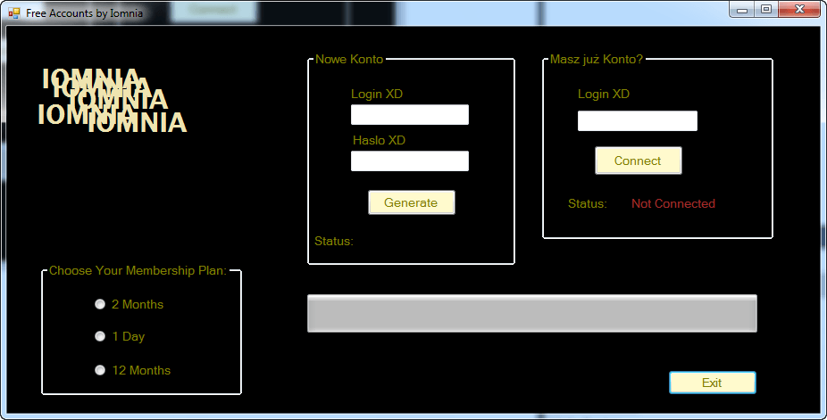 Witam,przygotowałem gotowy skrypt dla tych co dopiero zaczynaja zabawe z Visual Basic .Tego gotowca można użyć do Generowania np. Keygenów lub Konta Premium !! Public Class Form1 Private Sub Timer1_Tick(ByVal sender As System.Object, ByVal e As System.EventArgs) Handles Timer1.Tick ProgressBar1.Increment(1) If ProgressBar1.Value = ProgressBar1.Maximum Then Timer1.Stop() Dim key As Integer key = (Rnd() * 5) Select Case key Case 1 TextBox1.Text = "mama" TextBox2.Text = "0796" Case 2 TextBox2.Text = "kubica" TextBox1.Text = "5626" Case 3 TextBox1.Text = "majka123" TextBox2.Text = "2378" Case 4 TextBox2.Text = "aleo23" TextBox1.Text = "2734" Case 5 TextBox1.Text = "iomnia" TextBox2.Text = "1123" End Select MsgBox("DZIEKUJE XD ") End If If ProgressBar1.Value = 20 Then Label6.Text = "Connceting to Server" End If If ProgressBar1.Value = 40 Then Label6.Text = "Hacking Account" End If If ProgressBar1.Value = 60 Then Label6.Text = "Testing Account" End If If ProgressBar1.Value = 80 Then Label6.Text = "Account Ready" End If If ProgressBar1.Value = 100 Then Label6.Text = "Password: Ready" End If End Sub Private Sub Button2_Click(ByVal sender As System.Object, ByVal e As System.EventArgs) Handles Button2.Click End End Sub Private Sub Button1_Click(ByVal sender As System.Object, ByVal e As System.EventArgs) Handles Button1.Click Timer1.Start() ProgressBar1.Value = ProgressBar1.Minimum End Sub Private Sub GroupBox2_Enter(ByVal sender As System.Object, ByVal e As System.EventArgs) Handles GroupBox2.Enter End Sub Private Sub Button3_Click(ByVal sender As System.Object, ByVal e As System.EventArgs) Handles Button3.Click Timer2.Start() ProgressBar1.Value = ProgressBar1.Minimum End Sub Private Sub Timer2_Tick(ByVal sender As System.Object, ByVal e As System.EventArgs) Handles Timer2.Tick If ProgressBar1.Value = ProgressBar1.Maximum Then Timer1.Stop() End If ProgressBar1.Increment(1) If ProgressBar1.Value = 20 Then Label8.Text = "Conneceting to Server" End If If ProgressBar1.Value = 40 Then Label8.Text = "Testing Account" End If If ProgressBar1.Value = 80 Then Label8.Text = "Testing Account" End If If ProgressBar1.Value = 100 Then Label8.ForeColor = Color.LawnGreen Label8.Text = "Connect" End If End SubEnd Class Pokaże wam jeżeli pożądacie bardziej wiarygodnego ProgressBar'a.Sztuczke która polega na zmianie interwału ze 100 na 1000. 1.Klikamy na Timer1 . 2.Poprawej stronie szukamy Interval 3. ZMIENIAMY 100 NA 1000 4. Gotowe nasz czas ładowania jest wolniejszy .- 2 odpowiedzi