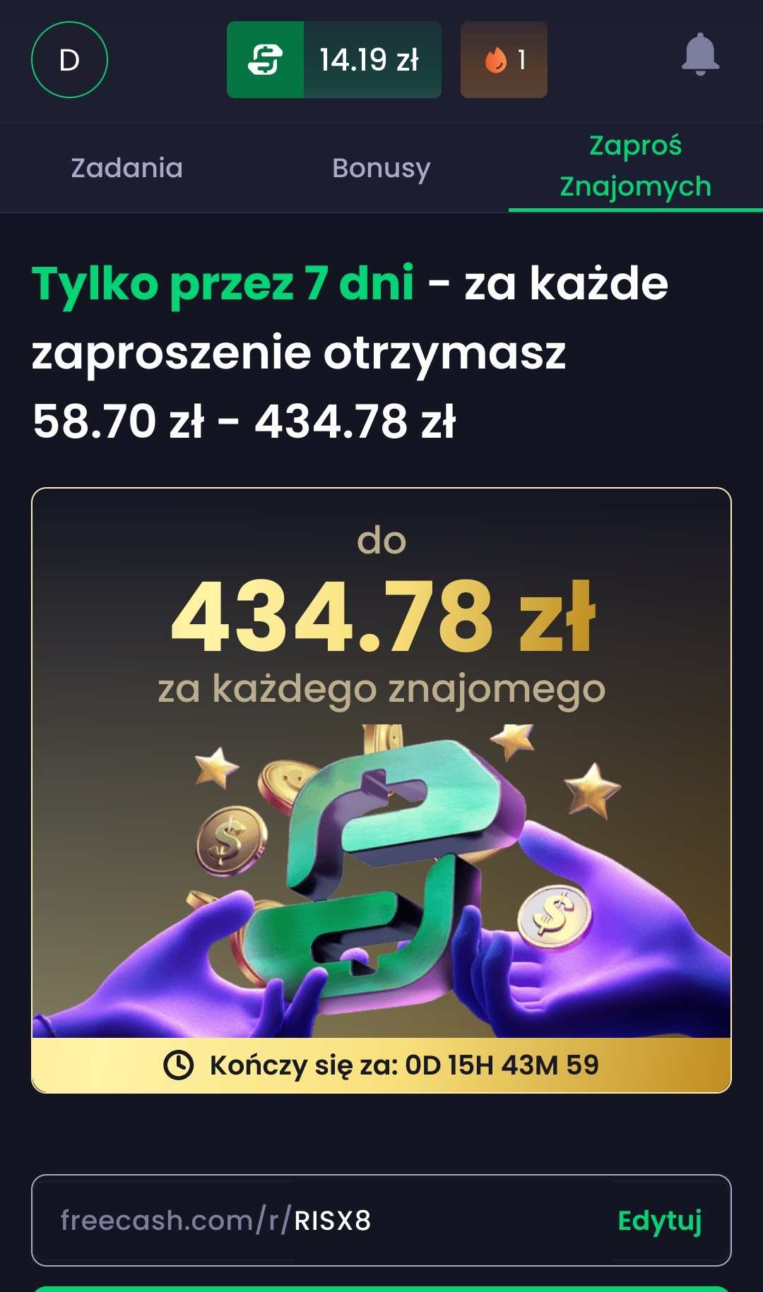 1. Oczekuję: -Zainstalowanie dowolnej gry na Freecash i zagranie kilka minut Wykonanie pierwszej wypłaty (PIERWSZA WYPŁATA OD 80 zł JEST MOŻLIWOŚĆ ANULOWANIA ZA 80 I MOZNA WYPŁACIĆ OD 1 ZŁ) -KYC Link do otrzymania nawet 450 zł ! Ważny tylko 7 dni ! https://freecash.com/r/RISX8 2. W zamian oferuję: DO 450 ZŁ 3. Czas oddania refbacku: NATYCHMIAST INSTANT LUB PO OKRESLONYM CZASIE ZATWIERDZENIA PRZEZ FREECASH 4. Kontakt: TELEGRAM PEARCEMARTYN FORUM MAKE CASH 5. Forma wypłaty refbacku: 6. Data zakończenia promocji z której korzystasz: 9 PAŹDZIERNIKA 7. Gwarancja zwrotu kosztów w przypadku niepowodzenia: BRAK ZWROTOW 8. (opcjonalnie) Dodatkowy opis oferty: DO 9 PAŹDZIERNIKA MOZLIWOSC ZGARNIĘCIA DO 450 ZŁ -