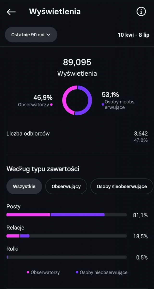 Hej, ktoś w innym temacie zadał podobne pytanie, więc i ja rzucę swoje. Posiadam kanał, na który nie wrzucałem zupełnie nic od 9 miesięcy. Jedyne co wrzucane było na kanał to niecałe 30 shortsów w 2024 roku. Shortsy były w całości po polsku, z jednego programu, odbiorcy to sami Polacy. Wyniki za 2024: Wyniki za 2025 (gdzie już nic nie wrzucałem): Odbiorcy: Kanał nie jest zmonetyzowany. Do tego mam profil na Instagramie o tej samej tematyce z ponad 1000 followersami - tam nie było nic wrzucane od maja TEGO roku (na robienie rolek i wrzucanie na YT nie miałem już czasu, więc postowałem tylko na Insta do maja). Teraz jest lipiec, więc ostatnie 90 dni mogę tylko podrzucić: Ile mogę realnie i uczciwie za te dwa konta "zawołać"? Mogę też dorzucić Twittera dokładnie z tym samym 550+ followersów. Wszędzie realni, polscy obserwatorzy, żadnych blokad czy banów.- 1 odpowiedź