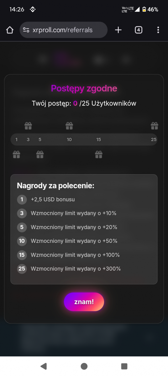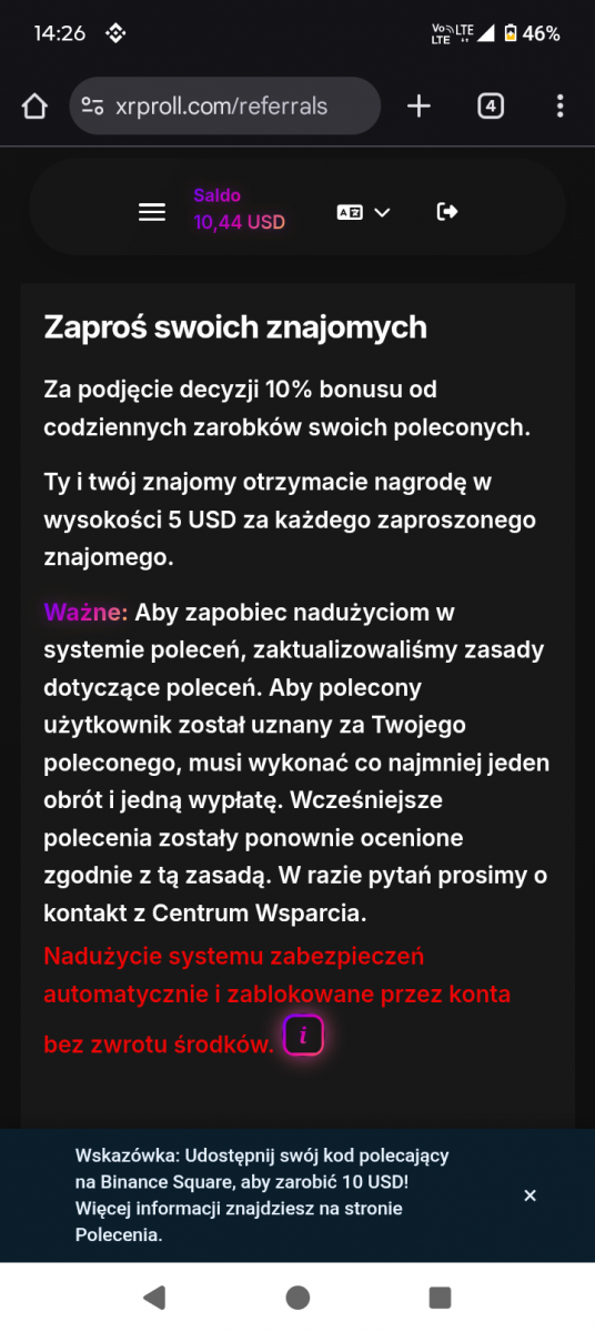 Siemka znalazłem ciekawą stronę 10$ za rejestrację można wypłacić jakiś % na koncie STANDARD mały bo mały przy zaproszeniu znajomych to rośnie ale nie trzeba , i codziennie kręcić kołem fortuny i odebrać do 0.90$ Reflink: https://xrproll.com/register?referral=6uyGu Czysty link: https://xrproll.com/