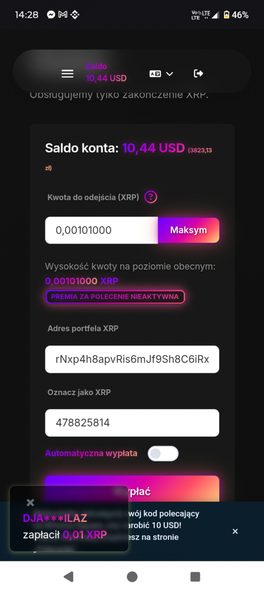 💥 Darmowe XRP Roll - codziennie do 800 USD! 💰 Nowa strona, która naprawdę płaci w XRP!Wystarczy zarejestrować się i kręcić kołem raz dziennie - każda próba to darmowe XRP 💎 ✅ Na start dostajesz 10 USD bonusu!✅ Dodatkowo 10% od dziennych zarobków Twoich poleconych✅ Wypłaty tylko dla użytkowników Binance (więc polecam mieć konto)✅ Czas odbioru nagród - zaledwie 3 minuty dziennie! 💸 Można zarabiać od 100 do 800 USD dziennie, zależnie od aktywności i liczby poleconych! ⚠️ Pamiętaj - zakaz tworzenia multikont, inaczej konto zostanie zablokowane bez możliwości odzyskania środków. 🔗 Zarejestruj się tutaj:👉 🔥 Wbijaj, kręć co 10 minut i zbieraj darmowe XRP! Im więcej poleconych - tym większe zyski.Nie przegap okazji - czas start! 🚀 Sama rejestracja Bez kyc Wyplacalne💥