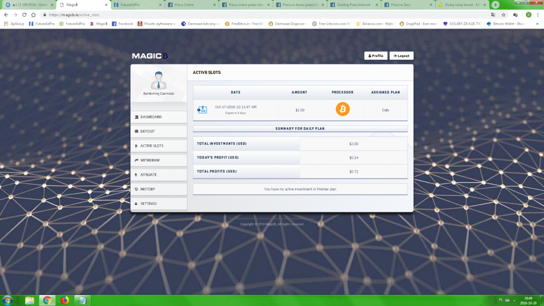 MagicB Witaj program pomnaża nasze małe ilości btc ! inwestycjia 144% na 12 dni !Minimum 2 $ ! Polecam spróbować z minimum by zobaczyć z czym to się je PŁACI ! Czysty link : https://magicb.io @ Depozycik złożony 2 $ i se rośnie zobaczymy czy płaci dam ss- 2 odpowiedzi