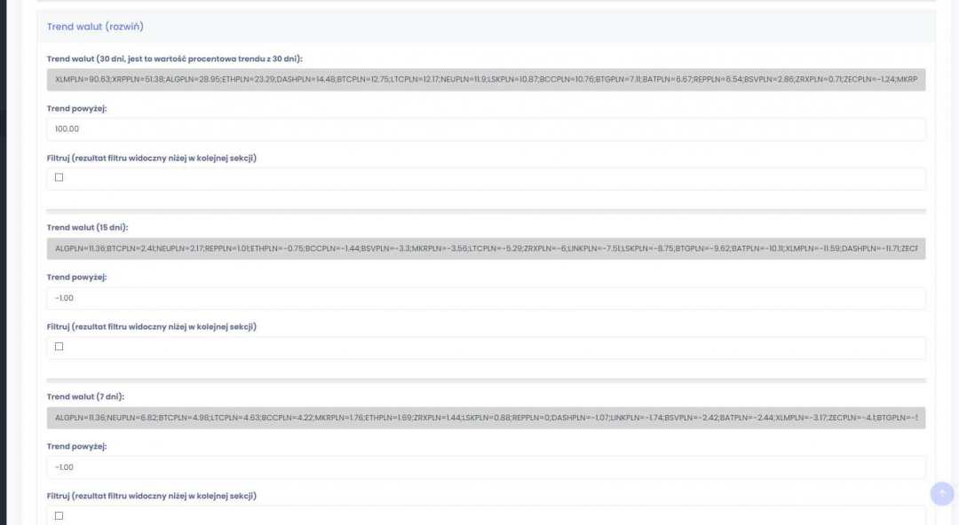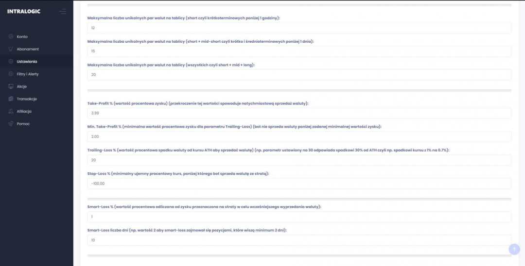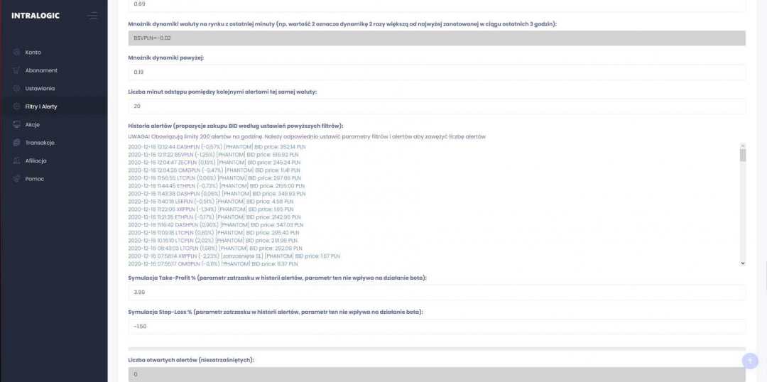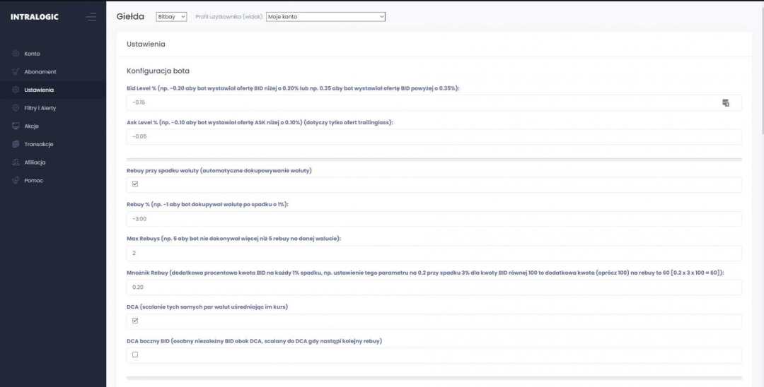 Witam, jestem nowy na forum i powoli je poznaję. Chciałbym się z wami podzielić sprawdzonym przeze mnie botem do handlowania kryptowalutami na binance. (nie jest to autoreklama) link: https://intralogic.eu reflink: https://intralogic.eu/cryptobot.aspx?reflink=MEJZUN (20% zniżki) Bot działa w dwóch trybach: 1. Kopiowanie ruchów(dla mniej zaawansowanych użytkowników): Możemy ustawić kopiowanie sygnałów innych użytkowników, oni ustawiają bota według swoich filtrów a my kopiujemy ich ruchy. ze swojej strony polecam kopiować gracza: https://intralogic.eu/dashboard/bot/default.aspx?id=binance&item=monitored&profile=-7411 można na tej stronie przejrzeć jego ruchy i zarobki. 2. Własne ustawienie filtrów( dla bardziej zaawansowanych) Jest tutaj od groma ustawień które można zmieniać, przykłady na samym dole. Osobiście nie znam się na tyle na krypto żeby samemu ustawiać filtry (próbowałem), więc kopiuję ustawienia profilu podanego wyżej. Wpłacając 1700zł na binance i kupując bota za 300 zł zarobiłem 1400zł. (aktualnie skończył mi się abonament i nie przedłużam go aż kryptowaluty trochę się uspokoją bo np. dziś bitcoin zaliczył -11%.) Na stronie dostępny jest chat dla wszystkich użytkowników, w razie pytań chętnie pomagają, administrator (i twórca) również dobrze tłumaczy rzeczy których nie rozumiemy Bot jest ciągle rozwijany użytkownicy często proszą na czacie o dodatkowe funkcje i jeżeli są sensowne to powstają. W razie pytań odpowiem na komentarze. Jest to mój pierwszy post więc proszę o wyrozumiałość. przykładowe ustawienia bota (jest tego dużo więcej):