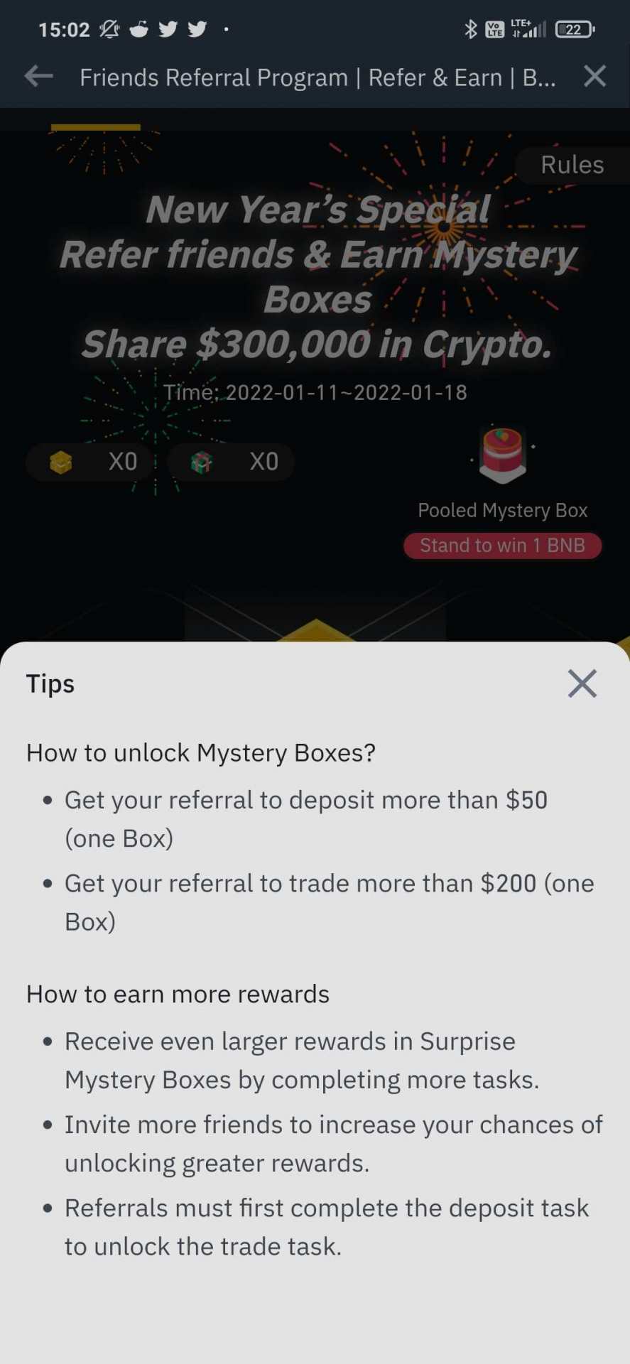 Witam serdecznie! Binance przygotowało nową promocję od dziś do 18 stycznia 2022. Za rejestrację z linku polecającego oraz wykonanie weryfikacji KYC i depozytu na kwotę co najmniej 50 USD (lepiej troszkę więcej np. 55$) otrzymacie MysteryBox z losową kryptowalutą o wartości do 500$. Dodatkowo można zdobyć drugiego boxa za wykonanie transakcji o wysokości 200$ (sprzedaż/kupno). Ogólna pula nagród to aż 300000$, więc można ładnie zarobić za samo założenie konta (ale także za polecanie znajomym, którzy razem z wami mogą otrzymać kolejne mystery boxy z zawartością do 500$). 1. Zarejestruj się na Binance Ref: https://www.binance.com/en/activity/referral-entry?fromActivityPage=true&ref=LIMIT_HNRQ8509 Czysty link (bez bonusu): https://www.binance.com/en/activity/limited-referral/NEWYEAR1?utm_source=Lite_banner 2. Przejdź weryfikację KYC 3. Wpłać minimum 50-55$ poprzez depozyt gotówkowy, zakup za pomocą karty kredytowej/debetowej, handel P2P lub depozyt kryptowalutowy w wysokości ponad 50$. Za sam depozyt otrzymasz mystery boxa w którym można znaleźć do 500$. 4. Zrób transakcje na minimum 200$ na dowolnej parze np. BTCUSDT tzn. możesz kilka razy kupić i sprzedać. Za wykonanie wolumenu otrzymasz drugi MysteryBox. 5. Możesz teraz także polecać swoich znajomych w taki sam sposób i otrzymywać razem z nimi kolejne MysteryBoxy (maksymalnie do 20).-