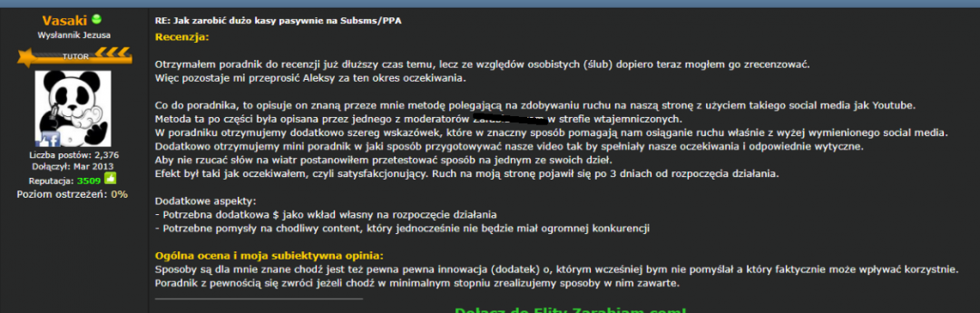 1. Nazwa poradnika/niszy: Jak zarabiać pasywnie na Afiliacji z wykorzystaniem Youtube + Bonus 2. Opis poradnika/niszy: Witam Serdecznie w 2018 roku wypuszczony został przeze mnie poradnik "Jak zarabiać pasywnie na Sub sms/PPA (100 tyś w rok)" oto przykładowa recenzja z tamtego poradnika: Mineło od tamtego czasu ponad 7 lat! Przez te 7 lat wiele się zmieniło, Sub sms już praktycznie nie istnieją( i bardzo dobrze). Ale nie zmieniło się jedno: Youtube to dalej 2 największa wyszukiwarka na świecie! Daję to naprawdę ogrom możliwości, jeżeli chodzi o zarobek. Muszę realnie przyznać, że prawie każdy cent, który zarobiłem na internecie był wygenerowany dzięki Youtube - Ale nie bezpośrednio jak niektórzy myślą, przez ADSENSE. Adsense jest dla ludzi, którzy lubią ryzyko i liczenie na to, że ktoryś z filmów kiedyś pojdzię w Viral. Naprawdę bardzo mało osób rozumie, że Youtube to studnia ze złotem i ogromny generator trafficu. Aby zarobić kasę, główne co jest potrzebne to ruch i dobry produkt prawda? Jeżeli chodzi o ruch z Youtube, to jest najwyższej jakości i przechodzi w prawie każdym programie partnerskim. Przejdźmy do konkretów: Pisząc ten poradnik, miałem pewne wątpliwości. Z jednej strony chciałbym aby ktoś się czegoś nauczył lub nawet zmienił swoje życie ( a ja przy tym zarobił). Z drugiej jednak strony, zastanawiałem się, czy nie zrobię sobie konkurencji i czy nie znieszczę metody. Postanowiłem, że zrobię limit maksymalnie 20 osób "dlatego też cena to nie 100 zł". Jako że mój poprzedni poradnik, który nie był nawet w połowie dobry jak ten, rozszedł się jak ciepłe bułeczki, tym razem także jest limit, także kto pierwszy ten lepszy. W Cenie dostajecie Obecny poradnik + mój stary z 2018 roku GRATIS! No ale czekaj... Co właściwie dowiem się z Poradnika? Chciałbym aby ten poradnik odmienił Twoje spojrzenie na wykorzystanie Youtube do zarobku, ma za zadanie nauczyć Cię: Po pierwsze, jak szukać złotej Niszy, znaleźć odpowiedni program partnerski i jak Pozcjonować Film na Youtube aby nalazł się w top 1-5. Tak to wszystko czego potrzebujesz żeby zaczać zarabiać PASYWNIE pieniądzę. Nie będzie za to tam lania wody, motywujących cytatów itd. Skoro Wiesz, że chodzi o program partnerski i youtube, to właściwie po co Ci mój poradnik? Diabeł tkwi w szczegółach i tak jest także tym razem. Wydałem podejrzewam około tysiaca jak nie lepiej pln na testy Youtuba, tylko w tym roku. TAK - na same testy, czyli to co działa, to co nie.... Ty już tego nie musisz robić, ja muszę... Ślędzę jak działa algorytm Youtube, dlaczego pewne filmiki się wybijają i jak się wybijają - Jak to zrobić bez liczenia na farta. Po dziesiatkach nieudanych prób, moje obecna metoda na wybijanie filmów, działa niemal za każdym razem. Oczywiście, czym fraza z mniejszą konkurencją tym lepiej - i o tym także wspominam w poradniku. W skrócie co dostajesz: 1. Nauczysz się szukać Nisz pod programy partnerskie/afiliacje (lub ewentualnie własne produkty jeżeli chcesz, ale nie polecam). 2. Nauczysz się optymalizować filmy na Youtube. 3. Nauczysz się wybijać filmy w topkę - aby przynosiły Ci genialne źródło ruchu, które z łatwością zmonetyzujesz w ten lub inny sposób. Dodatkowo dostajesz ode mnie w Gratisie mój stary poradnik z 2018 roku na temat zarabiania na PPA. Chociaż tamta metoda na wybijanie filmów na YT, już nie działa - to wszystko inne działa. Więc masz wybór: 1.Chcesz działać na dłuższą metę, powoli i żmudnie - ale za to na przyszłość pasywnie i w pełni moralnie, tak abyś nie tylko Ty, ale i klienci byli zadowoleni = Czerpiesz wiedzę tylko z nowego poradnika. 2. Chcesz zarobić szybko, bez względu na wszystko (PPA) - Także jesteś to w stanie zrobić wybijając filmy na Youtube korzystając z wiedzy ze starego poradnika i opierając się na wiedzy o pozycjonowania z nowego. Aczkolwiek mam nadzieję, że większość osób jednak będzie chciała pójść pierwszą ścieżką - bo choć jest powolniejsza i o wiele trudniejsza daje więcej satysfakcji i możliwości rozwoju. Poza tym, daje poczucie tworzenia czegoś, co także w pewnym stopniu pomaga innym. Będąc szczerym, nawet jeżeli nie sprzedałaby się żadna sztuka, płakać też nie będę Dalej po prostu będę robił i zarabiał swoje z mniejszą konkurencją - ale wiadomo, dodatkowa kasa się przyda, jak każdemu ^.^ A samemu i tak nie ogarnę wszystkich nisz na świecie 3. Źródło pozyskania: Własne. 5. Kontakt: Prywatna Wiadomość lub telegram: @aleks17233 ewentualnie wiadomość email: zielko17215@gmail.com 6. Cena: Pakietu: 597 397 PLN! 7. Sposób zapłaty: Paypal, Bank, Revolut 8. Ilość Dostępnych Sztuk: 16/20