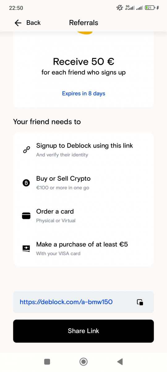 1. Oczekuję: Rejestracja z mojego linka: https://deblock.com/a-mdn458 Kyc, wpłata 100€ w krypto, sprzedaż oraz dwie transakcje kartą po 5€ 2. W zamian oferuję: 55€ 3. Czas oddania refbacku: Od razu gdy otrzymam bonus 4. Kontakt: Forum. 5. Forma wypłaty refbacku: Revolut, krypto, blik, Deblock 6. Data zakończenia promocji z której korzystasz: 27 Października 7. Gwarancja zwrotu kosztów w przypadku niepowodzenia: Tak 8. (opcjonalnie) Dodatkowy opis oferty: