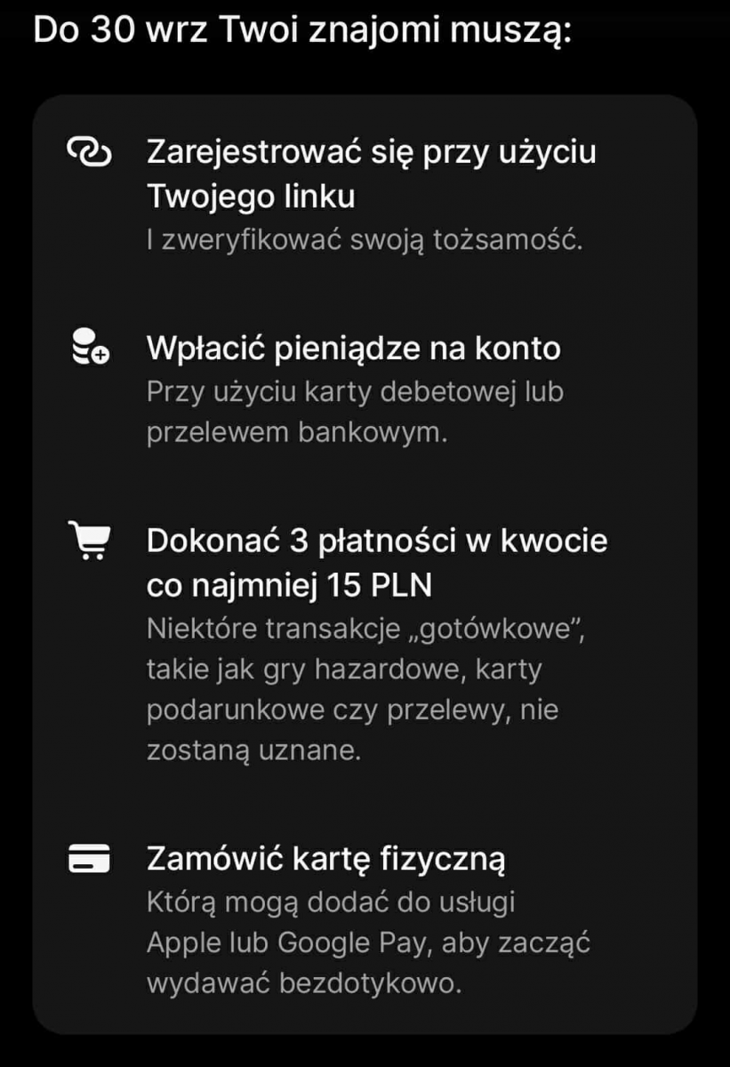 1. Oczekuję: a. Skopiuj reflink (jest na dole) do przeglądarki, a następnie załóż konto i się zweryfikuj za pomocą dowodu tożsamości. Po udanej weryfikacji, przejdź do zakładki Kryptowaluty, a następnie niżej kliknij w "Edukacja" - Znajdziesz tu quizy za które otrzymasz darmowe krypto waluty (które później możesz sprzedać i otrzymać złotówki, aktualnie nie posiadam wiedzy ile z tego wychodzi na czysto, kwoty mogą się wahać w granicach 20-40PLN). b. Wybierz darmowy (na 30 dni) plan premium i zamów za darmo kartę fizyczną. (Po kilku dniach pomagam anulować bezpłatnie plan premium, aby nie naliczały się opłaty za plan. Po wykonaniu tych czynności musisz wykonać 3 płatności kartą wirtualną (musisz ją stworzyć w zakładce "karty", nie wybieraj różowej) na kwotę co najmniej 15PLN każda. Protip - możesz kupić na allegro 3x20PLN kod PSC i doładować nimi Skrill, ze skrilla na revolut i pieniądze w większości zostaną odzyskane, zadanie wykonania trzech transakcji zostanie zaliczone. 2. W zamian oferuję: 100PLN 3. Czas oddania refbacku: W momencie otrzymania przeze mnie bonusu za polecenie i spełnienie przez Ciebie warunków promocji, w tym przypadku powinno to trwać jeden dzień po spełnieniu warunków promocji. 4. Kontakt: Telegram: @Lunnulq lub forum. 5. Forma wypłaty refbacku: BLIK, przelew, revolut 6. Data zakończenia promocji z której korzystasz: 20.10.2025 7. Gwarancja zwrotu kosztów w przypadku niepowodzenia: Brak gwarancji, zalecam kontakt ze mną przed rozpoczęciem rejestracji - jeśli nie czujesz się pewnie, ze wszystkim pomogę i wytłumaczę. 8. (opcjonalnie) Dodatkowy opis oferty: Reflink: https://revolut.com/referral/?referral-code=lukaszpiotr_p!OCT1-25-AR-H2&geo-redirect Czysty link: https://revolut.com/ Aktualizacja: Multikonta nie są brane pod uwagę. (03.10.2025 19:44)