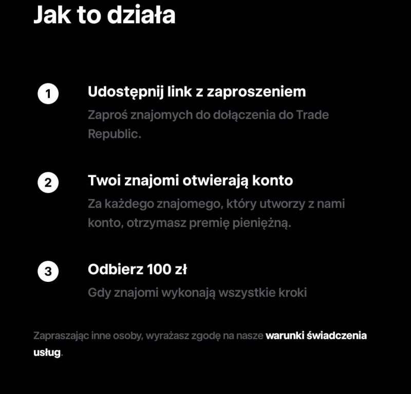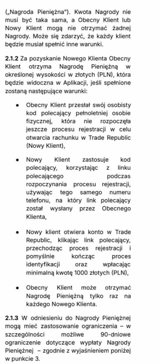 1. Oczekuję: Rejestrację z linku ,ewentualnie + wpisanie kodu polecającego Dołącz do Trade Republic - Mądry sposób, by inwestować, płacić i zyskać. Otwórz konto korzystając z linka. https://refnocode.trade.re/6z6xp80q 2. W zamian oferuję: 50 zł jak Trade Republic zatwierdzi te kroki ( Jest to testowa promocja ) 3. Czas oddania refbacku: Instant lub po określonym czasie 4. Kontakt: Telegram PearceMartyn Forum Make cash 5. Forma wypłaty refbacku: Waluta FIAT lub KRYPTO 6. Data zakończenia promocji z której korzystasz: Do odwołania 7. Gwarancja zwrotu kosztów w przypadku niepowodzenia NIE ZWRACAM ŻADNYCH KOSZTÓW PONIEWAŻ JEST TO PROMOCJA TESTOWA DLA CHĘTNYCH. ROBISZ NA WŁASNĄ ODPOWIEDZIALNOŚĆ. 8. (opcjonalnie) Dodatkowy opis oferty: TRADE REPUBLIC PROMOCJA 50 ZŁ ZA DEPOZYT 1000 ZŁ I KYC .