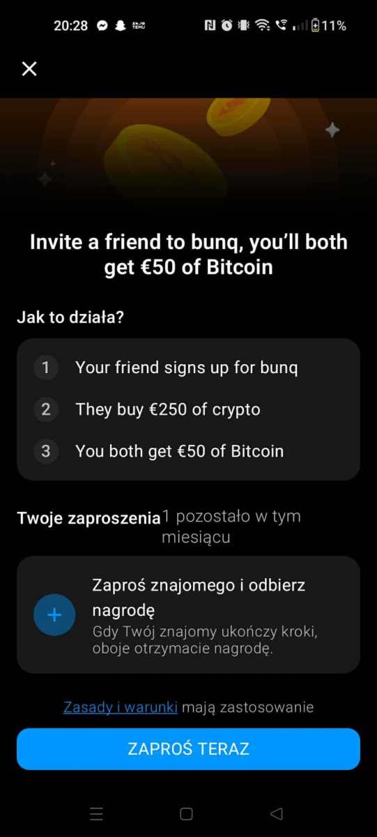 1. Oczekuję: Rejestracji z mojego refflinku (otrzymasz go w wiadomosci sms, w tym celu skontaktuj sie ze mną" oraz kupno a następnie sprzedaz kryptowaluty za minimum 255 euro . 2. W zamian oferuję: Bonus 50 Euro od bunq (-koszty) + 20EURO odemnie w ramach podziękowania. 3. Czas oddania refbacku: Natychmiast po otrzymaniu przez nas bonusow czyli natychmiast. 4. Kontakt: Zalecam kontakt na forum lub na telegramie @Bolsonz 5. Forma wypłaty refbacku: Blik/Revolut 6. Data zakończenia promocji z której korzystasz: Do odwolania