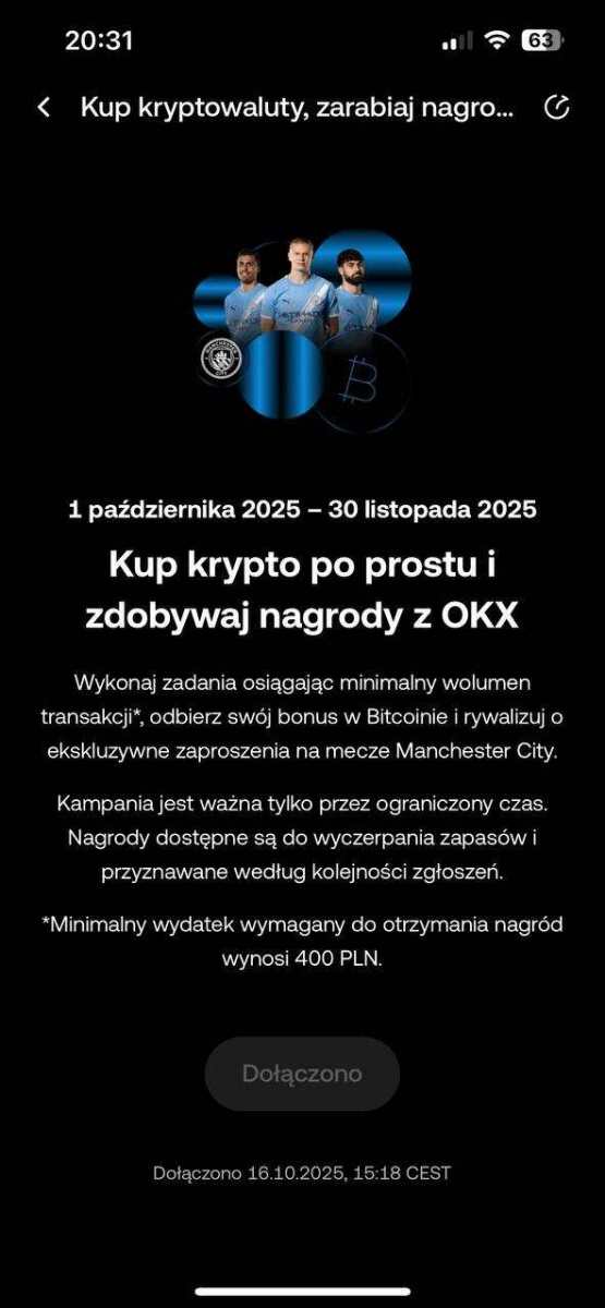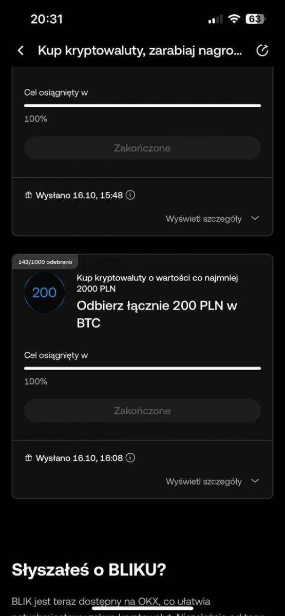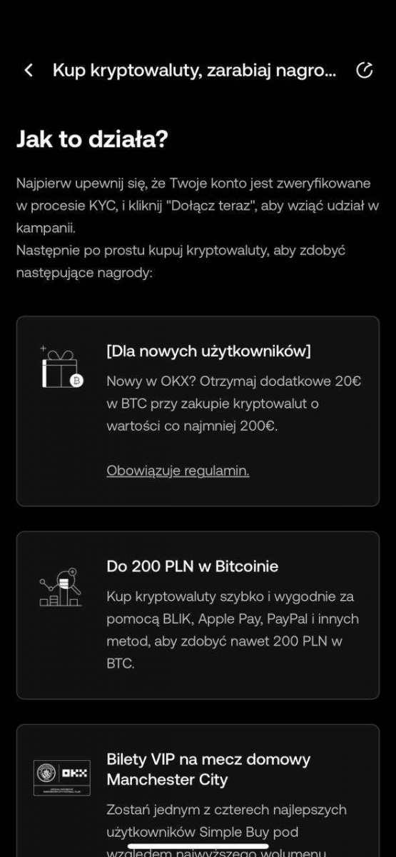 1. Oczekuję: Rejestracja na Giełdzie OKX Tranzakcja Trade na 200€ krypto (Możliwość zrobienia po 20€ Trade 10x + możliwość wplaty w FIAT) Zweryfikuj się KYC Możesz także użyć mojego kodu polecającego: 51713790. https://my.okx.com/join/51713790 2. W zamian oferuję: 20€ Refbacku 3. Czas oddania refbacku: Instant lub po określonym czasie 4. Kontakt: Telegram PearceMartyn Forum Make Cash 5. Forma wypłaty refbacku: Waluta FIAT krypto 6. Data zakończenia promocji z której korzystasz: Do odwołania 7. Gwarancja zwrotu kosztów w przypadku niepowodzenia: Nie zwracam żadnych kosztów ze względu tej promocji która jest promocją miezwrotna 8. (opcjonalnie) Dodatkowy opis oferty: Wykonaj kroki na giełdzie OKX zrób trade na 200€ lub po 20€ X10 Wystarczy wpłacić 200€ w fiat lub krypto i kupić krypto o równowartości 200€. Można na przykład 10 razy po 20€ Zarejestruj się z linku zrób KYC Dostajesz 20€ za rejestrację i trade 200€. Kwalifikują się także konta które są aktywne ale nie otrzymały nagrody za rejestrację. Mozna konto zamknąć i założyć ponownie z refa pod inny numer i e-mail.💶 Można wpłacić w fiat lub krypto I zrobić 10 x trade po 20€ Dodatkowe opcje : Wpłata najpierw 400 zł = 50 zł Wpłata następna 600 zł = 50 zł + 20€ Wpłata jeszcze 1000 zł = 100zl Można zrobić od razu tym samym depozytem co wpłacone. Otrzymasz 20€