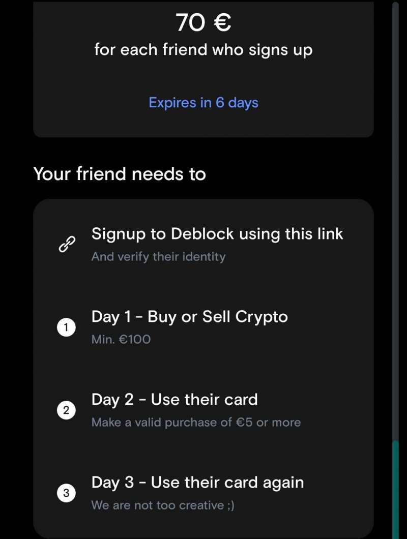 1. Oczekuję: Rejestracja z linku Join me on Deblock 1 miejsce : https://deblock.com/a-ysk833. 2 miejsce : https://deblock.com/a-lbq432. Kyc + potwierdzenia maila Wykonanie wymaganych kroków na Deblock czyli : Zakup lub sprzedaż min 100€ krypto Tranzakcja kartą na 5€(założenie karty) Użycie karty jeszcze raz 3. Czas oddania refbacku: Instant lub po określonym czasie 4. Kontakt: Telegram PearceMartyn Forum Make Cash 5. Forma wypłaty refbacku: Waluta FIAT lub KRYPTO 6. Data zakończenia promocji z której korzystasz: 26 października 7. Gwarancja zwrotu kosztów w przypadku niepowodzenia: Nie zwracam żadnych kosztów rób na własny rachunek 8. (opcjonalnie) Dodatkowy opis oferty: 2 miejsca na Deblock czyli z jednego zaproszenia zgarniesz 40€ a z drugiego 10€ max 15€ . Czyli potrzebne są mi dwie osoby
