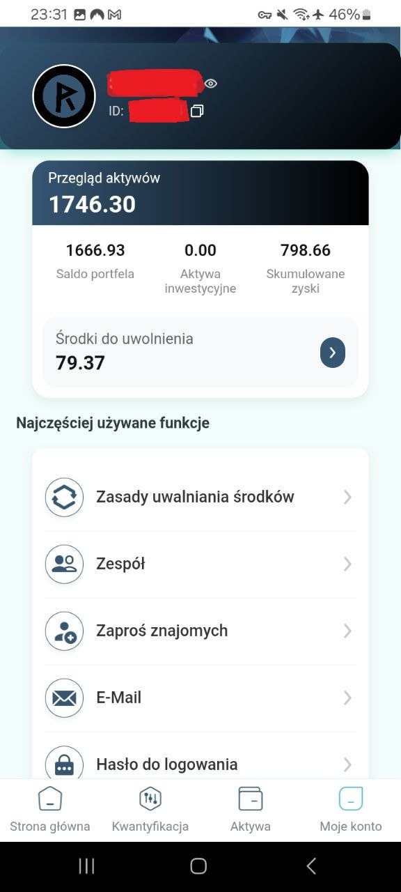 Witam, od miesiąca bawię się X-Flexi po upadku Coinplexa, wrzuciłem kilka groszy aby zobaczyć jak to działa a co najważniejsze czy wypłaca zgromadzony zysk i aktywa. Po osiągnięciu kwoty 500 usdc nie moge przejść na poziomie wyżej bo muszę tworzyć zespół. W tej chwili zatrzymałem sie na 500 dolcach i kwantyzacja powoduje że każdego dnia zarabiam między 8,5 do 9,4 usdc ale tylko od kwoty 500 dolców. Jeśli ktoś ma ochotę to zapraszam z mojego linka aby budować zespół. Mam założone 3 konta i potrzebny jest KYC do wypłaty. Jesli ktoś ma pytania to zapraszam, a na koniec wrzucę kilka screenów. Pozdrawiam. Czysty link do pobrania z Play Store https://play.google.com/store/apps/details?id=com.xflexiapp.xflexiapp Kod zaproszenia przy rejestracji jest obowiazkowy i podaje moj bo innego nie znam: Q73JV8 Dodaje jeszcze kilka screenów z info jeśli wogole kogoś zainteresuje Moje wypłaty