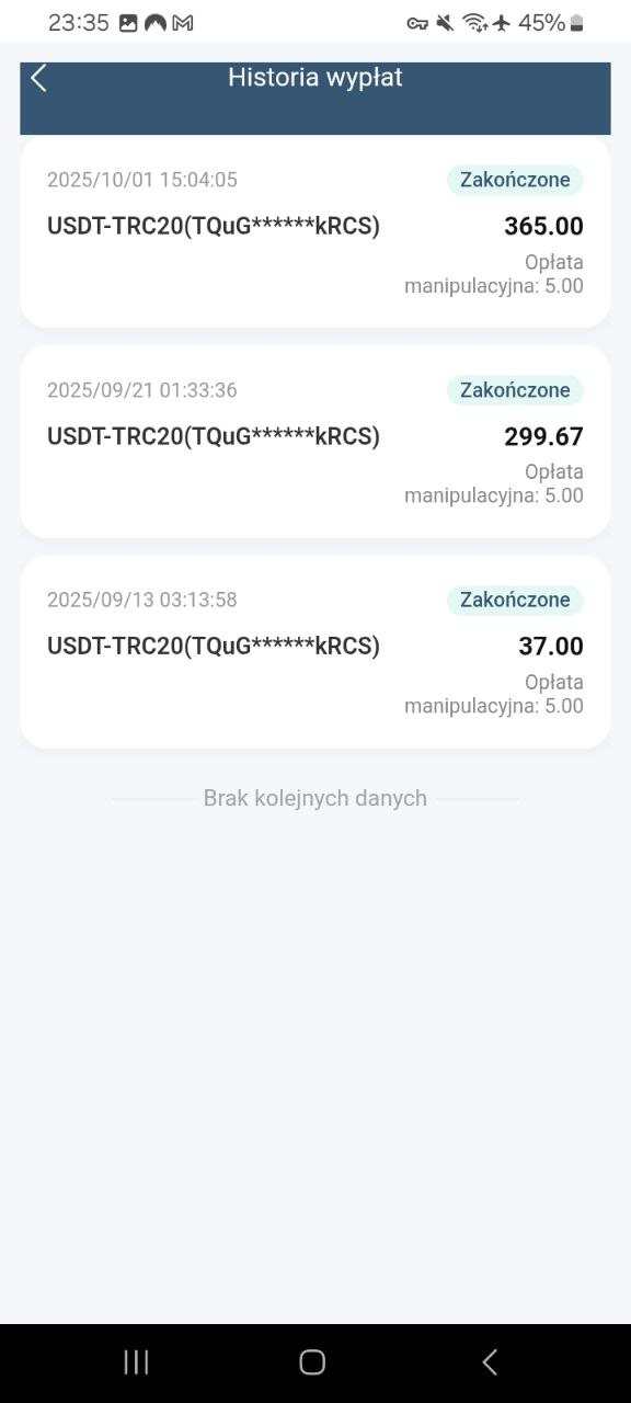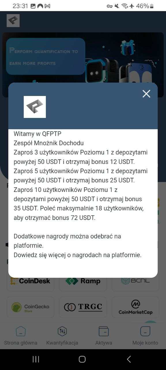 Witam. Premiera tego projektu odbyła się 21 sierpnia 2025. Strona/czysty link: https://ptpkz.org/ Kod zaproszenia: GJKPQST Link z zaproszeniem: https://ptpkz.org/pages/register/register?code=GJKPQST Aplikacja na androida do pobrania: https://play.google.com/store/apps/details?id=com.lht.qfptp Link do oficjalnej grupy: https://t.me/PDPOfficialgroup Link do grupy Polskiej: https://t.me/PTPPolishGLobal2025 (dołączając do grupy, możesz wnioskować o 2 USDT) - Minimalny depozyt: 30 USDT - Minimalna wypłata: 10 USDT - Opłata za wypłatę: 5 USDT - Czas realizacji wypłaty: 0-72 godziny - Codzienny zysk: 2-2,2% - Możliwość wypłaty kapitału i zysków w dowolnym momencie Zrzuty ekranu z aplikacji mobilnej: Moje potwierdzone wypłaty: W razie pytań, chętnie odpowiem. Pozdrawiam. -