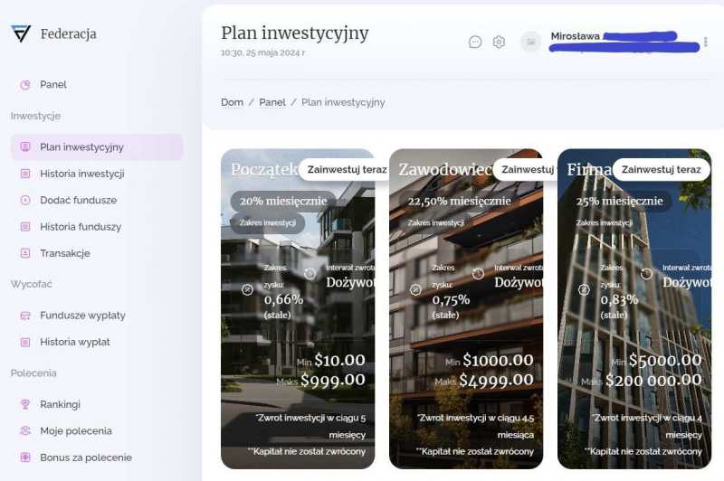 Federacja to jedna z pierwszych na świecie platform inwestycyjnych w nieruchomości z instytucjonalnymi zwrotami, dostępna dla wszystkich. Federation Network zapewnia sieć biznesową umożliwiającą budowanie własnej kariery w marketingu sieciowym. Nieruchomości zawsze były najbardziej stabilną inwestycją. Na całym świecie nieruchomości pozostają zdecydowanie największą klasą aktywów. Siedziba główna: Londyn – UK 168-173 High Holborn, London England, WCIV 7AA Wstępna premiera we wrześniu 2023 r. ️ Premiera: 16 grudnia 2023 r. 50 USD oferowane za 500 USD inwestycji ️ Minimalny depozyt: 50 USD, minimalna reinwestycja: 10 USD Zwrot gotówki zostanie wygenerowany codziennie dopisywane do salda Twojego konta 3 plany inwestycyjne: 0,66% dziennie, 0,75% dziennie, 0,83% dziennie Działa 7 dni w tygodniu Przynależność: 3 bonusy _ Bonus od depozytu na 10 poziomach: 10%, 3,5%, 3%, 2,5%, 2%, 1,5%, 1%, 0,5%, 0,5%, 0,5% _ Pozostały bonus na 10 poziomach: 10%, 7%, 5%, 2,5%, 2%, 1,5%, 1%, 0,5%, 0,25%, 0,25%, płatne codziennie o północy (00:00 czasu francuskiego) _ Premia za rangę (bonusy) Zoom spotkania co tydzień ️ Wpłaty i wypłaty w USDT-trc20, karta bankowa i przelew, Apple pay również ️ W przypadku wpłat kartą bankową poprawili bezpieczeństwo procesora płatności przed oszustwami, systematycznie aktywując zabezpieczenia 3D Secure, aby zapobiec płatnościom zostanie odrzucony przez Twój bank. ️ Bonus powitalny 50 $ Po rejestracji, inwestując 500 $ lub więcej, 50 $ zostanie przelane na Twoje saldo ️ Plik PDF firmy jest dostępny na stronie, widać, że strona działa i że stoi za nią dobry zespół. Monitorowanie i wsparcie dla wszystkich partnerów, często pojawiają się wiadomości na ich kanale Telegram. Oficjalny YouTube: https://www.youtube.com/@federationnetworkofficial Oficjalny telegram: https://t.me/federationofficial Wsparcie: @federation-app.com JAK DZIAŁA SPONSORING W SIECI FEDERACJI Federacja oferuje 3 bonusy: _ Premia depozytowa na 10 poziomach: 10%, 3,5%, 3%, 2,5%, 2%, 1,5%, 1%, 0,5%, 0,5%, 0,5% _ Premia rezydualna na 10 poziomach: 10%, 7%, 5%, 2,5%, 2%, 1,5%, 1%, 0,5%, 0,25%, 0,25% _ Premia za rangę (bonusy) JAK WYPŁACIĆ PIENIĄDZE Z SIECI FEDERACJI Wypłaty i opłaty: minimum 50 USD Opłaty za depozyt: 0%, Opłaty za wypłaty: 2,5 USD + 3% Czas przetwarzania wypłat: Wypłaty są zautomatyzowane na blockchainie i są realizowane średnio w ciągu 1 do 3 godzin Minimalny depozyt: 50,00 Minimalna wypłata: 50,00 Reflink https://member-federation.com/register/miron83 Czysty https://member-federation.com/register Prezentacja Oficjalny telegram: https://t.me/federationofficial Link do telegramu: https://t.me/FEDERATIONNETWORK Wsparcie: @federation-app.com