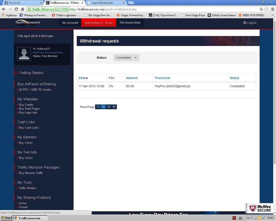 Witam chciałbym polecić system klikania w reklam. zarabiamy dziennie do 0.10$ a minimalna wypłata to 2$ po średnim kursie 3.72 zł. Żeby codziennie zarabiać na tej stronie będziesz potrzebować 15-30 min maksymalnie. Codziennie również klikasz tzw. surfowanie na stronie głównej My account w start surfing musisz kliknąć 10 stron po 20s wtedy twoje konto trafficmonsoon będzie się kwalifikowało do otrzymywania płatnych reklam. Dodam jeszcze że jest także możliwośc zainwestowania 50$ w zakup baneru i ostatecznie zarobienia do 55$ czyli 110% zysku ale trzeba byc codziennie aktywnym.Każdy przez ciebie polecony również zarabia dla ciebie do 0,10$ dziennie. 100 poleconych to już 10$ dziennie. Możliwe jest także pozycjonowanie funpage,stron internetowych itd. Zapraszam serdecznie do rejestracji: https://trafficmonsoon.com/?ref=mateusz33 Jeśli jesteś zainteresowany prowadzę grupę na fb poświęconą zarabianiu w internecie: https://www.facebook.com/groups/1568747870004982/ W razie pytań proszę pisać na mój email: mateuszjozefczyk@onet.pl Załączam jeszcze dowód wypłaty.