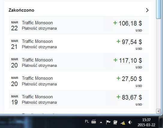 Witam Chciałbym Wam przedstawić nowy serwis - TrafficMonsoon.com. Czym jest Traffickmoonson? Traffic Monsoon to wchodząca na polski rynek firma, która specjalizuje się działalnością reklamową w Internecie. Jak? Wysyła on Twoją stronę, którą reklamujesz, na inne strony reklamowe, co czyni Twoją ofertę widzialną przez szeroką publikę. Traffic Monsoon potrafi skierować na nasze strony wartościowy i ukierunkowany ruch, co sprzyja polecaniu w nim np. innych projektów czy biznesów w których działamy. Jest to program, który również umożliwia wysoki zarobek w Internecie. Dlaczego o nim piszę? Ponieważ zarabiam tam i uważam, że jest jednym z najstabilniejszych programów. Oferuje on swoim użytkownikom bezpłatne sposoby na zarobienie gotówki tylko poprzez korzystanie z ich usług. Traffic Monsoon sprzedaje również pakiety reklamowe (AdPack), które pozwolą Ci zarobić nawet do 110% z inwestycji. Moje zarobki przedstawione są na poniższym screenie i myślę, że są naprawdę imponujące. Zarabiać rozpocząłem około 3 tygodnie temu. Naprawdę program warto sprawdzić i jest on godny polecenia. A tutaj zwykły link: http://trafficmonsoon.com Zapraszam do dyskusji poniżej. W razie jakichkolwiek pytań zapraszam na PW lub na mail: taryheck@o2.pl Zapraszam do wspólnego zarabiania