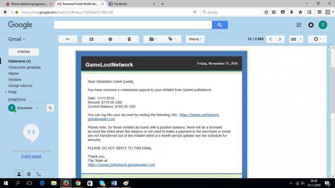 Witam wszystkich! Chciałbym Wam przedstawić tym razem naprawdę fajny temat z dziedziny MLM w który wszedłem 17 dni temu O PROGRAMIE GameLootNetwork network jest platformą gier na urządzenia mobilne (tablety, smartfony itp.) na której możemy zarobić i to nie małe pieniądze! Dla obniżenia poziomu stresu możemy sobie pograć w przeróżne gierki oraz uczestniczyć w turniejach z nagrodami które firma organizuje. Oficjalny start programu odbył się w dniach 14-16 października 2016 w Las Vegas Kto stoi za sterami firmy? Lance Baker od 20 lat jest związany z branżą IT i produkcją gier mobilnych. Jest przedsiębiorcą z wieloletnim doświadczeniem. Założył kilka firm w branży nowych technologii. Napisał między innymi książkę na temat gier mobilnych: link tutaj! KTO ZA TYM STOI W PL? Za promowanie tego biznesu w Polsce wzięła się mocna ekipa która robi również Caribbean Bridge, ich strukturach w CB ma $3.5M obrotu! Ruszyli z tym tematem 30/09/2016r., wzięli się za to bardzo poważnie, ich celem jest w jak najszybszym czasie wbicie wraz z ekipą BLACK CROWN Organizują codziennie webinary o godz. 21.00, możemy liczyć na wszelką pomoc z ich strony Temat jest mega świeży, więc można zająć bardzo dobrą pozycje zanim chłopacy uruchomią mechanizm pozyskiwania nowych osób, który będzie miał za zadanie łatanie dziur w strukturze, budują teraz solidne fundamenty, aby na ich podstawie móc się piąć wyżej. PLAN MARKETINGOWY DLA KOGO JEST TEN BIZNES? Ten biznes jest dla osób które potrafią polecić 3 osoby, to jest wymóg aby zacząć zarabiać w tym programie. Po zaproszeniu tych 3 osób otrzymujemy na starcie rangę RUBIN co daje nam $150 na nasz portfel oraz uprawnia nas do zarobków już $5 każdego dnia! Zaczynają już powoli lecieć spady z góry, które są liczone do naszego łącznego obrotu! (nie myl z własnymi poleconymi, bo 3 osoby musisz zaprosić sam, aby zacząć zarabiać na tym!) Ja jestem 17 dni w programie i bez specjalnego polecania gdziekolwiek w tym tygodniu awansuje j na 2 poziom i będę miał zarobki dzienne stałe na poziomie $20 praktycznie nic nie robiąc! Pomagam teraz tylko moim poleconym, aby w jak najszybszym czasie kwalifikowali się do bonusów! JAK MOGĘ DOŁĄCZYĆ? Napisz do mnie na Facebooku https://www.facebook.com/sebastian.cwiek.9 Czysty Link - http://gamelootnetwork.com/en/ Mój Link -https://cwiek.gamelootnetwork.com/join-/ Z czystego linku nie da się zarejestrować Jest szansa znalezienia się nisko w strukturach, więc może warto ją wykorzystać - decyzja należy do Ciebie MOJE WYPŁATY Z GAME LOOT NETWORK