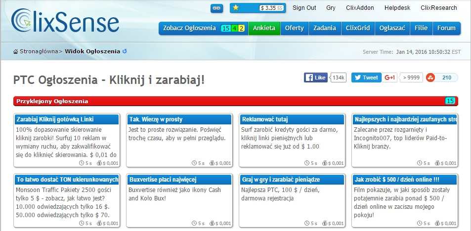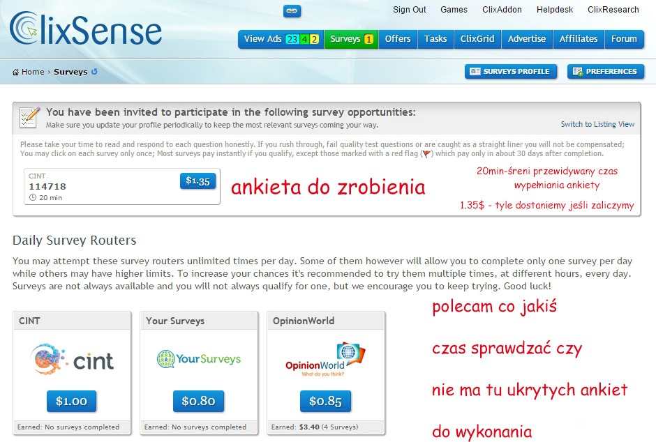 Witam!Jest kilka stron poświęconych CLIXSENSE, ale nie widziałem nigdzie poradnika więc pomyślałem że Ja spróbuję coś napisać CO TO JEST CLIXSENSE?ClixSense.com to program typu PTC, czyli zarabianie w nim polega na oglądaniu reklam, klikaniu w reklamy, wypełnianiu ankiet. Obecnie to jeden z najlepszych programów na rynku PTC. Początkowo nie cieszył się dużą popularnością wśród polskich użytkowników – ze względu na wysokie minimum do wypłaty (realizowane tylko czekiem). W 2011 roku zmniejszono jednak minimum do 10$ (obecnie 8$) i dodano możliwość wypłat poprzez system PayPal.CLIXSENSE – PRZYDATNE INFORMACJECzłonkostwo w ClixSense jest darmowe, legalne i w każdej chwili możesz z niego zrezygnować.ClixSense to program międzynarodowy. Otwarty jest na amerykańskich i międzynarodowych użytkowników. Aby przystąpić do programu musisz mieć minimum 16 lat.Właścicielem strony jest Jim Grago (USA), który zajmuje się również usługami hostingowymi. Firma zarejestrowana jest na terenie Stanów Zjednoczonych, a działa już od 2007 roku.Liczba użytkowników: 5,572,303 – stan z 8 stycznia 2016 roku.NA CZYM POLEGA ZARABIANIE, JAK ZARABIAĆ W CLIXSENSE?View Ads – tu klikamy w płatne linki i banery: $0.001 – $0.02 / za klik (dziennie około 10 – 25 reklam). Surveys – płatne ankiety – wartość od około $ 0,80 za wypełnienie ankiety wzwyż. Jest to zdecydowanie najlepsza część tego serwisu. Tu zarabiamy najwięcej. Dostajemy tu ankiety od wielu różnych firm takich jak: CINT, YourSurveys, OpinionWorld i na zaproszenie wiele innych takich jak Toluna itd. Ankiety są po polsku.ClixGrid – Klikanie w sekcji klików konkursowych: Codziennie w sekcji ClixGrid otrzymasz 30 szans na wygranie 10$ (nagrody od 0,1$ do 10$)Offers, Tasks – płatne oferty, zadaniaWYPŁATA W CLIXSENSE, ZLECENIE WYPŁATYWypłatę możesz zażądać na konta PayPal, Paytoo, Payza , Neteller, po zgromadzeniu minimum 8$ – użytkownicy Standard oraz 6$ użytkownicy Premium. Wypłaca punktualnie i bezproblemowo.Nie ma żadnego ryzyka, bo nie trzeba nic inwestować.Z wyrejestrowaniem też nie ma problemu. Po 3 nieaktywnych miesiącach, kasują konto automatycznie.Konto Premium na rok! – 17.00 $ Teoretycznie jest pomocne tylko przy poleconych i checkliście i kliku innych mniej istotnych kwestiach, choć niektórzy mówią że mają coś więcej ankiet po zmianie. Jest to oczywiście sprawa indywidualna, ale ja osobiście zaraz po rejestracji dobiłem właśnie do tych 17$ i wykupiłem PREMIUM. Dopiero wtedy zbierałem na wypłatę (wtedy juz od 6$).Język – Angielski (wystarczy znać podstawy aby poruszać się po menu, ankiety są po polsku)Polsko języczne Forum.Jeśli nie zna się angielskiego, można sobie pomóc instalując Google Chrome, które tłumaczy automatycznie obce języki. Tak wygląda stronka po przetłumaczeniu: Zaczynamy. Najpierw trzeba się zarejestrować: Wpisujemy kolejno: 1. Imię 2. Nazwisko 3. Email 4. Dla potwierdzenia raz jeszcze email 5. Hasło 6. Jeszcze raz to samo hasło 7. Nazwa naszego konta 8. I na koniec klikamy Signup Now Na podstawie poniższego obrazka postaram się wytłumaczyć najważniejsze elementy strony: 1. Banery do wyklikania, na każdym widnieje kwota jaką dostaniemy za klikniecie i obejrzenie reklamy. Po naciśnięciu na baner ukażą się okienka z psami i jednym kotem. Musimy nacisnąć na kota. A następnie czekamy od 5 do 60 sekund zależnie od kwoty i na koniec możemy już zamknąć kartę. Pieniądze zostaną dopisane do naszego konta.2. Ankiety czyli to co najlepsze na tej stronce. Co jakiś czas będą tu wpadać różnego rodzaju ankiety do wypełnienia, za różne kwoty (rozrzut jest duży, od kilkudziesięciu centów do kilku dolarów). Proszę się nie zrażać że na początku będzie dużo z nich nie zaliczonych. Z czasem zauważymy jak powinniśmy odpowiadać i będzie coraz to lepiej wychodzić W pierwszej kolejności powinniśmy wypełnić SURVEYS PROFILE. Tylko proszę się dobrze zastanowić bo niektórych pozycji nie da się już zmienić, a inne można edytować dopiero po 60 dniach. Najlepiej oczywiście zaznaczyć że mamy dzieci, sami podejmujemy decyzje, mamy dużo zwierząt, dużo sprzętu, latamy samolotami itd...Pierwsza podstawowa sprawa przy wypełnianiu ankiet to powinniśmy wypełnić ją od początku do końca. Czyli nie przechodzić sobie w międzyczasie na inne karty w przeglądarce, nie robić screenshotów w trakcie, ani wykonywać innych czynności nie związanych z ankietą. Bo za takie rzeczy wypełnianie może zakończyć się przed czasem i ankieta nie zostanie zaliczona. Nie zawsze tak jest ale zdarzają się takie przypadki.I tak w skrócie kilka małych porad: Takich rzeczy jak wiek czy miejsce zamieszkania raczej nie przewidzisz jakie maja wymagania co do konkretnej ankiety. Ale już całą resztę z czasem łatwo wyczuć. Najważniejsze to nie pisz że czegoś nie potrafisz, nie robisz, nie lubisz, nie umiesz itd...Pytają się czy palisz to dajesz że tak, czy latasz samolotami-tak, czy masz dzieci-tak, czy korzystasz z mediów społecznościowych-tak, czy coś lubisz-tak, czy coś umiesz-tak...itd. Z czasem można wyczuć większość odpowiedzi, najgorsze są te początkowe: o wiek, miejsce zamieszkania.Jeśli pytają się czy czy pracujemy w wymienionych branżach to przeważnie dajemy że nie lub INNE. Ale i tu potrafią się zdarzyć wyjątki, czasem ta odpowiedź nie działa. Raz na jakiś czas się takie trafiają i trzeba się wstrzelić w jakąś branżęNie wiem dokładnie od czego to zależy ale czasem przy wyższych stawkach za ankietę dostajemy masę różnych branż do wyboru, chyba są to jakieś ankiety specjalistyczne bo tych kategorii do wyboru jest naprawdę sporo i wtedy przy wybraniu "inne" czy "żadne z powyższych" zostajemy wyrzuceni z ankiety. Jeszcze nie odkryłem jaką trzeba wybrać i czy jedna jest tylko możliwość czy więcej, jakby 