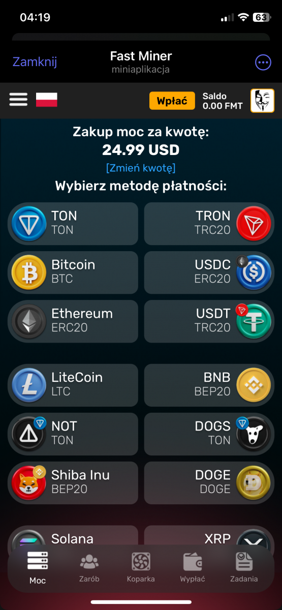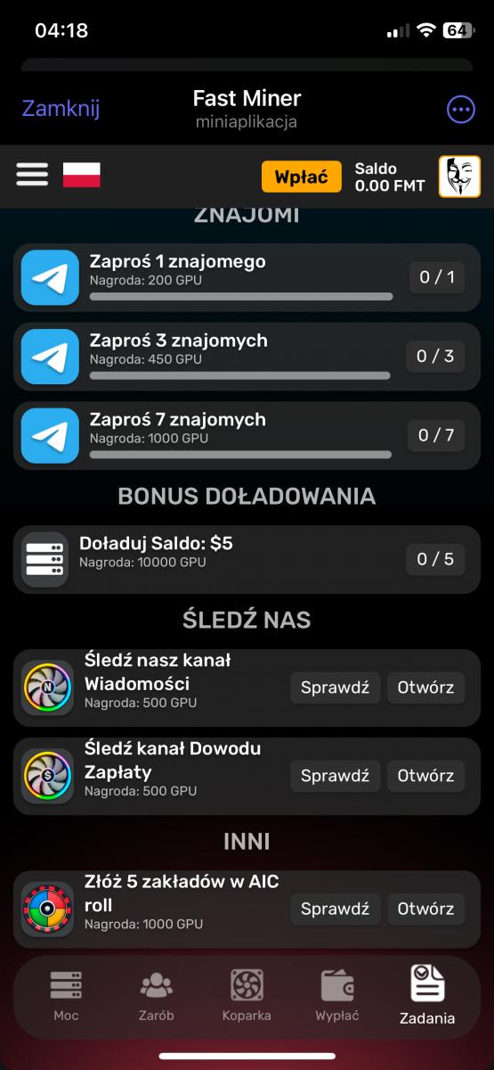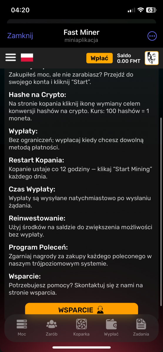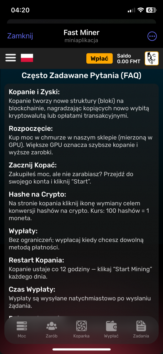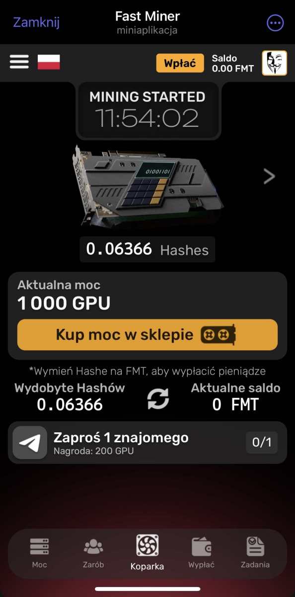 fastminer – Analiza Aplikacji do Kopania Kryptowalut (Telegram Bot) Reflink: https://t.me/MineFast_bot?start=394028 Czysty link: https://t.me/MineFast_bot?profile autorem tematu jest mineton. Wstęp Niniejszy dokument przedstawia analizę aplikacji (a właściwie Telegram Bota) "Fast Miner" na podstawie dostępnych informacji. Aplikacja ta reklamuje się jako platforma do łatwego kopania kryptowalut, oferująca użytkownikom możliwość zarabiania bez konieczności posiadania drogiego sprzętu. Główne Tematy i Funkcje: * Kopanie w Chmurze: Aplikacja promuje koncepcję kopania kryptowalut w chmurze, co eliminuje potrzebę zakupu i konfiguracji drogiego sprzętu. Zamiast tego użytkownicy kupują "moc" kopania (mierzoną w GPU), co bezpośrednio wpływa na ich zarobki. * Interfejs i Funkcjonalności: * Ekran Główny: Wyświetla aktualną moc kopania, liczbę wygenerowanych "hashów", saldo FMT (token aplikacji) oraz czas od rozpoczęcia kopania. * Sekcja "ZNAJOMI": Oferuje bonusy za zapraszanie nowych użytkowników do aplikacji (system poleceń). * Sekcja "BONUS DOŁADOWANIA": Umożliwia doładowanie salda za określoną kwotę w zamian za bonus w postaci GPU. * Sekcja "ŚLEDŹ NAS": Zachęca użytkowników do śledzenia kanałów informacyjnych i płatności w celu otrzymania dodatkowych GPU. * Kalkulator Zysków: Prezentuje potencjalne zyski z zakupu mocy kopania. * Wypłaty: Użytkownicy mogą wypłacać zarobione środki za pomocą różnych metod płatności (TRON, BNB, TON Coin i Litecoin). * Zakup Mocy: Aplikacja oferuje możliwość zakupu mocy kopania za różne kwoty i za pomocą różnych metod płatności (TON, Bitcoin, Ethereum, USDT, itd.). * FAQ: Odpowiada na podstawowe pytania dotyczące kopania. * Token FMT i Hashe: * Aplikacja korzysta z tokena FMT. Użytkownicy zarabiają hashe (moc obliczeniową), które następnie mogą być wymieniane na tokeny FMT. * Tokeny FMT można wypłacać na portfele kryptowalutowe. * System Poleceń (Referral): * Aplikacja zachęca do zapraszania znajomych, oferując bonusy i procent od ich zakupów. * System poleceń jest 3-poziomowy. * Przejrzystość i Uczciwość: * Aplikacja deklaruje transparentność i uczciwość. * Udostępniony jest kanał, gdzie można śledzić wypłaty. * Bonusy i Nagrody: * Aplikacja oferuje bonus rejestracyjny. * Dodatkowe bonusy i nagrody są dostępne za doładowanie salda, zapraszanie znajomych i śledzenie kanałów. Kluczowe Idee i Fakty: * Dostępność: Aplikacja celuje w użytkowników, którzy chcą kopać kryptowaluty bez ponoszenia dużych kosztów początkowych. * Model Biznesowy: "Fast Miner" zarabia na sprzedaży mocy obliczeniowej (GPU) do kopania. * Elementy Grywalizacji: Aplikacja stosuje elementy grywalizacji, co ma na celu zwiększenie zaangażowania użytkowników. * Ryzyko: Pamiętaj, że inwestycje w Fast Miner, jak w każdy HYIP, wiążą się z bardzo wysokim ryzykiem utraty całości kapitału. Nie inwestuj środków, których nie możesz sobie pozwolić stracić. * Metody Płatności: Szeroki wachlarz akceptowanych kryptowalut może wskazywać na próbę dotarcia do szerokiego grona odbiorców. Wnioski: Aplikacja "Fast Miner" prezentuje się jako łatwy sposób na wejście w świat kopania kryptowalut. Zastosowanie systemu poleceń, bonusów i elementów grywalizacji ma na celu zwiększenie zaangażowania. Niemniej jednak, jak w przypadku każdego projektu związanego z kryptowalutami, należy zachować ostrożność i dokładnie przeanalizować potencjalne ryzyko przed zaangażowaniem się. Zalecenia: * Dalsza Analiza: Należy dokładnie zbadać historię i wiarygodność firmy stojącej za aplikacją. * Czytanie Opinii: Przed inwestycją warto poszukać opinii innych użytkowników w internecie. * Ostrożność: Należy podchodzić z ostrożnością do projektów obiecujących bardzo wysokie zyski, zwłaszcza w tak niepewnym rynku jak kryptowaluty.