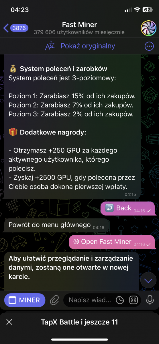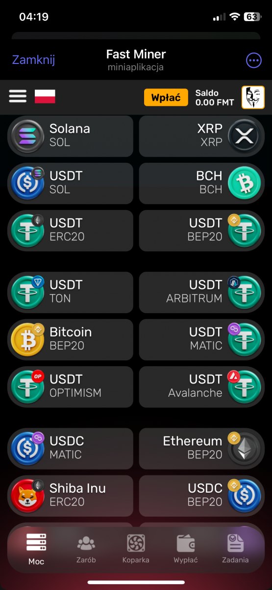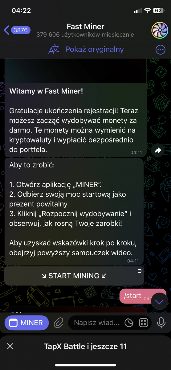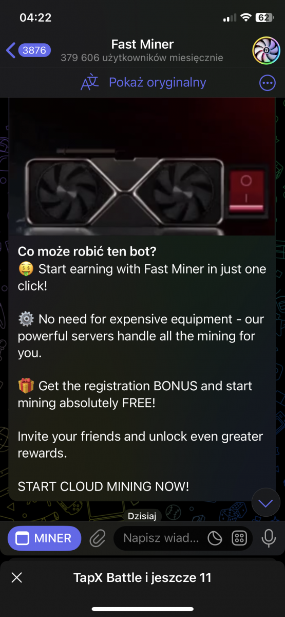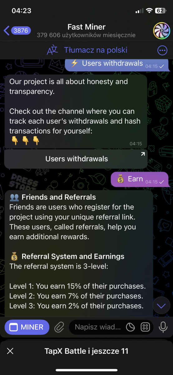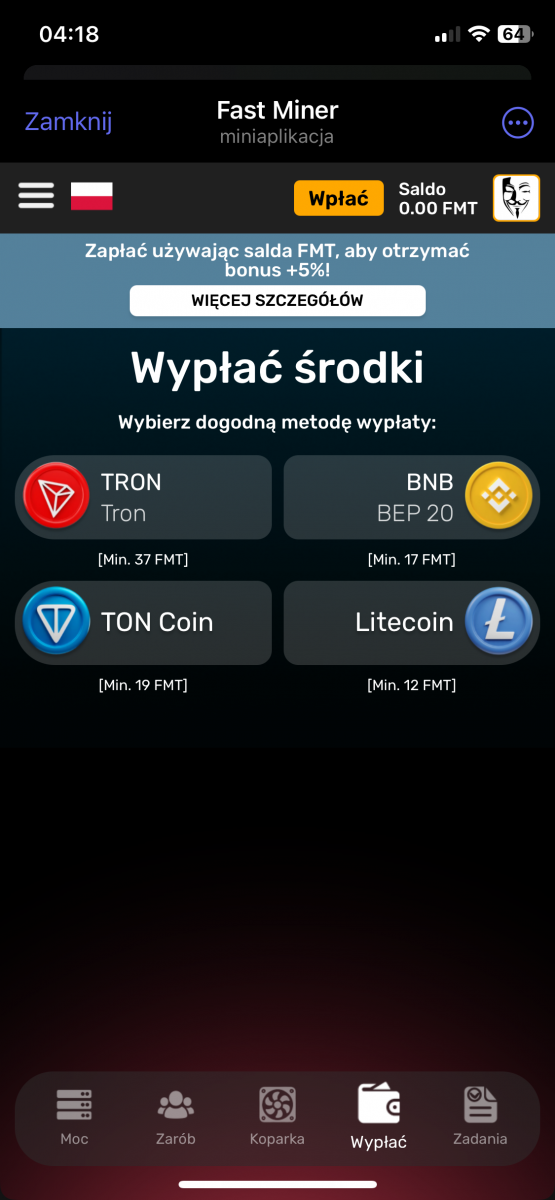 fastminer – Analiza Aplikacji do Kopania Kryptowalut (Telegram Bot) Reflink: https://t.me/MineFast_bot?start=394028 Czysty link: https://t.me/MineFast_bot?profile autorem tematu jest mineton. Wstęp Niniejszy dokument przedstawia analizę aplikacji (a właściwie Telegram Bota) "Fast Miner" na podstawie dostępnych informacji. Aplikacja ta reklamuje się jako platforma do łatwego kopania kryptowalut, oferująca użytkownikom możliwość zarabiania bez konieczności posiadania drogiego sprzętu. Główne Tematy i Funkcje: * Kopanie w Chmurze: Aplikacja promuje koncepcję kopania kryptowalut w chmurze, co eliminuje potrzebę zakupu i konfiguracji drogiego sprzętu. Zamiast tego użytkownicy kupują "moc" kopania (mierzoną w GPU), co bezpośrednio wpływa na ich zarobki. * Interfejs i Funkcjonalności: * Ekran Główny: Wyświetla aktualną moc kopania, liczbę wygenerowanych "hashów", saldo FMT (token aplikacji) oraz czas od rozpoczęcia kopania. * Sekcja "ZNAJOMI": Oferuje bonusy za zapraszanie nowych użytkowników do aplikacji (system poleceń). * Sekcja "BONUS DOŁADOWANIA": Umożliwia doładowanie salda za określoną kwotę w zamian za bonus w postaci GPU. * Sekcja "ŚLEDŹ NAS": Zachęca użytkowników do śledzenia kanałów informacyjnych i płatności w celu otrzymania dodatkowych GPU. * Kalkulator Zysków: Prezentuje potencjalne zyski z zakupu mocy kopania. * Wypłaty: Użytkownicy mogą wypłacać zarobione środki za pomocą różnych metod płatności (TRON, BNB, TON Coin i Litecoin). * Zakup Mocy: Aplikacja oferuje możliwość zakupu mocy kopania za różne kwoty i za pomocą różnych metod płatności (TON, Bitcoin, Ethereum, USDT, itd.). * FAQ: Odpowiada na podstawowe pytania dotyczące kopania. * Token FMT i Hashe: * Aplikacja korzysta z tokena FMT. Użytkownicy zarabiają hashe (moc obliczeniową), które następnie mogą być wymieniane na tokeny FMT. * Tokeny FMT można wypłacać na portfele kryptowalutowe. * System Poleceń (Referral): * Aplikacja zachęca do zapraszania znajomych, oferując bonusy i procent od ich zakupów. * System poleceń jest 3-poziomowy. * Przejrzystość i Uczciwość: * Aplikacja deklaruje transparentność i uczciwość. * Udostępniony jest kanał, gdzie można śledzić wypłaty. * Bonusy i Nagrody: * Aplikacja oferuje bonus rejestracyjny. * Dodatkowe bonusy i nagrody są dostępne za doładowanie salda, zapraszanie znajomych i śledzenie kanałów. Kluczowe Idee i Fakty: * Dostępność: Aplikacja celuje w użytkowników, którzy chcą kopać kryptowaluty bez ponoszenia dużych kosztów początkowych. * Model Biznesowy: "Fast Miner" zarabia na sprzedaży mocy obliczeniowej (GPU) do kopania. * Elementy Grywalizacji: Aplikacja stosuje elementy grywalizacji, co ma na celu zwiększenie zaangażowania użytkowników. * Ryzyko: Pamiętaj, że inwestycje w Fast Miner, jak w każdy HYIP, wiążą się z bardzo wysokim ryzykiem utraty całości kapitału. Nie inwestuj środków, których nie możesz sobie pozwolić stracić. * Metody Płatności: Szeroki wachlarz akceptowanych kryptowalut może wskazywać na próbę dotarcia do szerokiego grona odbiorców. Wnioski: Aplikacja "Fast Miner" prezentuje się jako łatwy sposób na wejście w świat kopania kryptowalut. Zastosowanie systemu poleceń, bonusów i elementów grywalizacji ma na celu zwiększenie zaangażowania. Niemniej jednak, jak w przypadku każdego projektu związanego z kryptowalutami, należy zachować ostrożność i dokładnie przeanalizować potencjalne ryzyko przed zaangażowaniem się. Zalecenia: * Dalsza Analiza: Należy dokładnie zbadać historię i wiarygodność firmy stojącej za aplikacją. * Czytanie Opinii: Przed inwestycją warto poszukać opinii innych użytkowników w internecie. * Ostrożność: Należy podchodzić z ostrożnością do projektów obiecujących bardzo wysokie zyski, zwłaszcza w tak niepewnym rynku jak kryptowaluty.