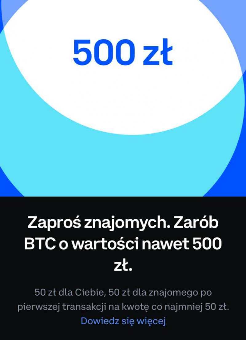 1. Oczekuję: Rejestracja z reflinka, depozyt minimum 50zł (zalecane 55/60) oraz wykonanie pierwszej transakcji na kwotę co najmniej 50zł (zalecane więcej). Link znajdziesz poniżej. 2. W zamian oferuję: Po wykonaniu przez Ciebie w/w czynności oddaje Ci 20zł z uzyskanego od Ciebie bonusu, a sam zarabiasz dodatkowe 50zł od Coinbase. 3. Czas oddania refbacku: W momencie otrzymania przeze mnie bonusu za polecenie i spełnienie przez Ciebie warunków promocji. 4. Kontakt: Telegram: @Lunnulq lub forum. 5. Forma wypłaty refbacku: Krypto 6. Data zakończenia promocji z której korzystasz: Data nieznana. 7. Gwarancja zwrotu kosztów w przypadku niepowodzenia: Przed rozpoczęciem rejestracji z mojego linka, zalecam wcześniejsze skontaktowanie się ze mną, aby potwierdzić wolne miejsce lub dostępność promocji, w celu uniknięcia nieporozumień. W przypadku braku wcześniejszego kontaktu ze mną, nie gwarantuję żadnych zwrotów. 8. (opcjonalnie) Dodatkowy opis oferty: Reflink: https://coinbase.com/join/XQWK8Q6?src=ios-link Czysty link: https://www.coinbase.com/pl Aktualizacja: Multikonta nie są brane pod uwagę. (03.10.2025 19:46)
