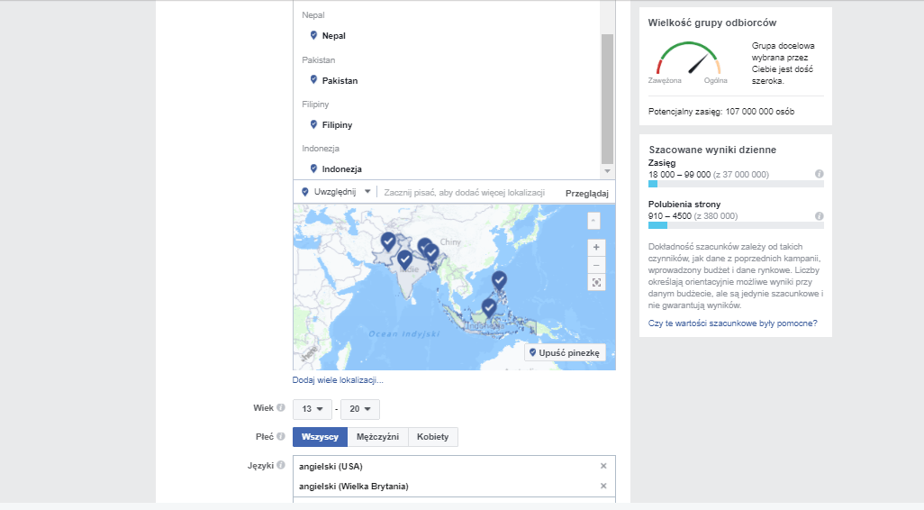 Wiem, że trochę osób kupuje fake like na fanpage ze względu na np. zwiększenie wiarygodności. Podaje wam sposób w jak bardzo tani sposób możecie kupić prawdziwe polubienia waszego fanpage korzystając z FB ads. Są to polubienia z krajów takich jak Indie, Nepal, Pakistan, Bangladesz, Filipiny, Indonezja - wiem, szału nie ma Ale i tak lepsze to niż kupowanie pakietów likeów nie wiadomo jakiego pochodzenia w podobnej a nawet czasami droższej cenie. Wychodzi średnio 1-2 gr za like a często może być nawet dużo niżej 1. Zakładamy konto reklamowe na Facebooku. 2. Wchodzimy w menadżer reklam. 3. Wybieramy opcje jak na zdjęciu poniżej: 4. Ustawiamy kraje jak w opisie, wiek i język jak na zdjęciu poniżej: 4. Zainteresowania - coś by było powiązane z naszym zdjęciem reklamowym i profilem na FB ale by potencjalny zasięg pozostał na poziomie paru milionów - czyli jak np. fanpage ze śmiesznymi filmikami to dajemy zainteresowania YouTube + Snapchat. Dobrze jest również wykluczyć osoby które lubią już nasz Fanpage. 5. Edytujemy umiejscowienie (odznaczamy prawą kolumnę). 6. Ustawiamy budżet - W zależności od portfela Ale polecam wszystkim ustawić reklamę na parę dni np. lepiej ustawić 3 dni po 3 złote niż jeden dzień za 9zł gdyż na ogól po 1-2 dni się zoptymalizuje reklama. 7. Klikamy na dole Dalej 8. Przesyłamy obraz zgodnie z zaleceniami! Jest to na prawdę ważne jeśli chcemy mieć tanią reklamę 9. Ustawiamy jakiś zachęcający tekst 10. Zatwierdzamy i czekamy na efekty Proszę pytać, pisać jak coś - reputy mile widzane