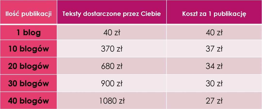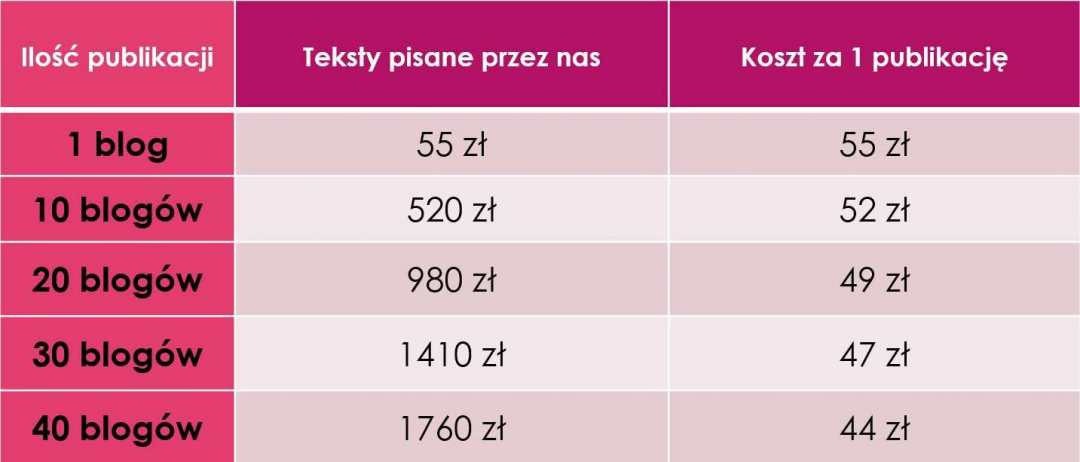 Oferujemy publikacje artykułów z linkiem DOFOLLOW na prywatnych stronach. 40 unikalnych polskich domen z historią nawet 25 lat. Dla każdej publikacji napiszemy od podstaw unikalny tekst powiązany tematycznie z Twoją witryną oraz umieścimy go w odpowiedniej kategorii. Przykładowe case study linkowanych przez nas stron: Linkowana strona pod AFILIACJĘ Linkowana strona pod ADSENSE Linkowana strona z kat. ZDROWIE Pozostałe: https://picabela.link/case-study-linkowanych-stron/ Strony z których pochodzi link: Polskie domeny .pl najwyższego poziomu Każda domena z unikalną grafiką z szablonem premium oraz dedykowanym logo Zróżnicowane IP, zróżnicowane DNSy Wszystkie strony z certyfikatami SSL Dobra historia. Najstarsza domena z 1996 roku (wg wayback machine) Unikalne pisane przez copywriterów artykuły (zero mieszarek) Nieduża ilość linków wychodzących Zaufanie dla wyszukiwarek (naturalne "nienabijane" współczynniki Trust Flow oraz Citation Flow) Dobry profil backlinków, naturalny (domeny przejęte po stronach domowych, firmowych, edukacyjnych, blogach) Ograniczona dostępność – sprzedaż tylko za naszym pośrednictwem Szybka indeksacja Dożywotni wpis Spora moc o czym przekonali się korzystający z oferty Właściwości publikowanych artykułów które otrzymasz w cenie. Unikalne, pisane przez copywriterów Min. 2000 znaków Tematyka związana z linkowaną stroną Obrazek (stockowy) związany z tematem CENNIK opcja z napisaniem tekstów CENNIK opcja z Twoimi tekstami Ceny netto. Przy opcji z tekstami pisanymi przez nas, ceniąc Twój czas, wystarczy że podasz nam linkowany anchor text oraz przypisaną mu stronę docelową dla każdej publikacji, a resztą zajmiemy się sami. Nie linkujemy stron o treściach niezgodnych z prawem oraz o tematyce 18+. Jeśli masz wątpliwości zawsze zapytaj przed zamówieniem. PEŁNA OFERTA oraz składanie ZAMÓWIEŃ na https://picabela.link/linki-z-blogow/ kontakt@picabela.pl lub przez PRIV