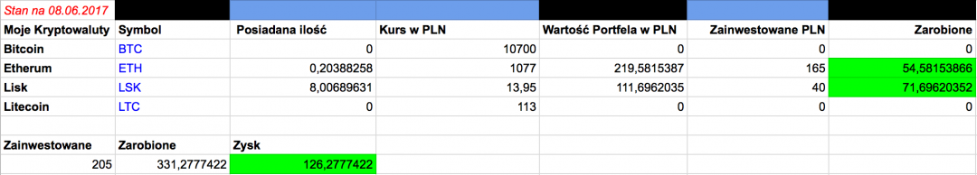 Cześć! Nazywam się Adrian, a to jest mój pierwszy wpis dotyczący mojej przygody z inwestowaniem w kryptowaluty. Oto kilka założeń tego dziennika: Wpisy będą pojawiać się raz w tygodniu przez najbliższy rok. Środki jakie będę inwestował będą to małe kwoty, za które będę kupował krypto. Uświadomienie, że kryptowaluty to ciekawa opcja inwestycyjna. Jestem otwarty na współpracę i pomoc innym. Wszystkie zainwestowane pieniądze jak i zyski pozostają w obiegu, tz. nie mogę ich wypłacić przez najbliższy rok, później natomiast mogę tylko 50% zysku. Bez zbędnego lania wody, zapraszam do wpisu pierwszego Tydzień 1 Inwestuję od zera. To już prawie miesiąc od momentu kiedy zainteresowałem się kryptowalutami. Przez ostatnie 2 tygodnie zacząłem powoli kupować dwa altcoiny (jest to określenie na waluty, inne niż BitCoin). Udało mi się kupić 0.2 Etherum i 8 Lisk. Dzisiejsze zestawienie wygląda następująco: jest to stan z 09.06.2017