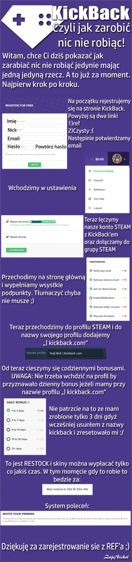 Witam, Mam dla Was fantastyczny program, który działa od lat i wypłaca w ciągu 3 dni roboczych. Jest to program AdBlast (REJESTRACJA TUTAJ!). Polega on na tym, że mamy do dyspozycji lvle (1-5) i AdPacki, w raz z zakupem AdPacków (10$, 50$ lub 100$) dostajemy prowizje 25% po 110 dniach, czyli jeśli uzbieramy po czasie już 10 takich AdPacków po 100$ to mamy 250$ za klikanie przez 2 minuty w dziennie w reklamy, gdzie Nasz wkład i kapitał cały czas rośnie! Rejestrując się z tego linku dostajesz ode mnie pełne wsparcie wraz z zespołem oraz większą prowizje jako polecony. Wszystkim z całego serca polecam i pozdrawiam.