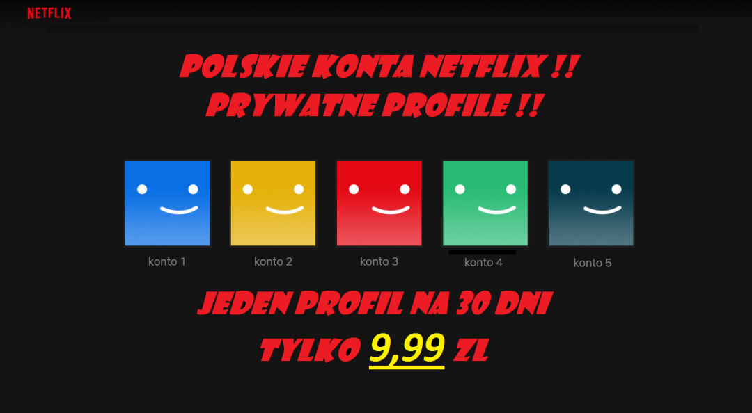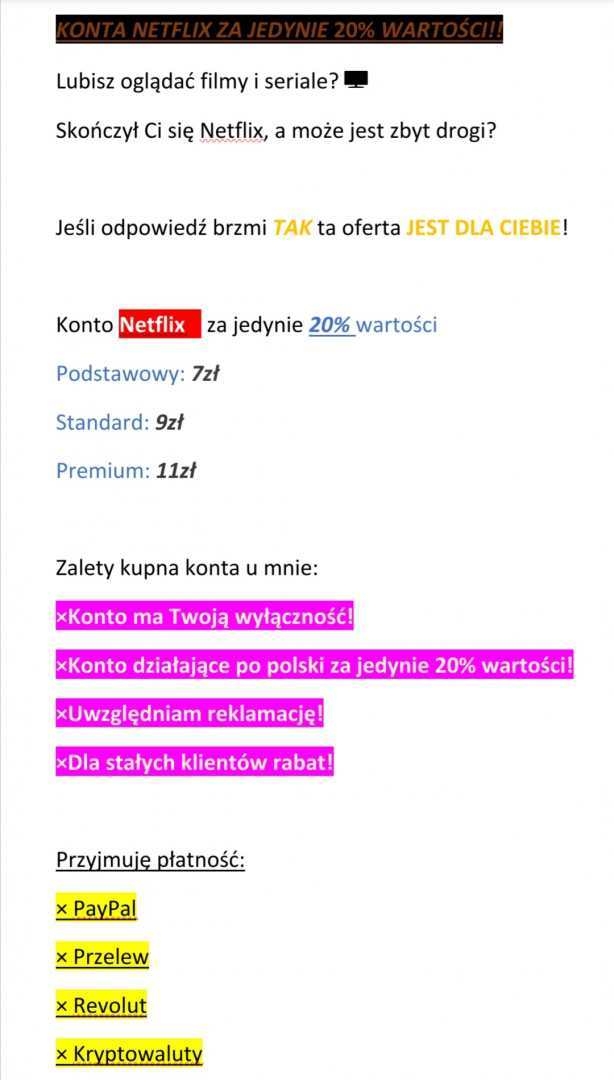 1. Nazwa przedmiotu: j.w 2. Opis przedmiotu: Na sprzedaż oferuję miesięczne konta NETFLIX obsługujące język Polski. . Cena wynosi odpowiednio: Podstawowy: 7zł Standard: 9zł Premium: 11zł Przy zakupie 5+ kont rabat -20% UWZGLĘDNIAM REKLAMACJĘ Z racji na moją niską reputację mogę przekazać dane jako pierwszy 3. Źródło pozyskania: właśne 4. Zdjęcia: 5. Kontakt: priv, fb: Stasiek Pieróg, mail: stasiekpie@gmail.com 6. Cena: 7/9/11zł 7. Sposób zapłaty: Przelew, Revolut, PayPal, Kryptowaluty