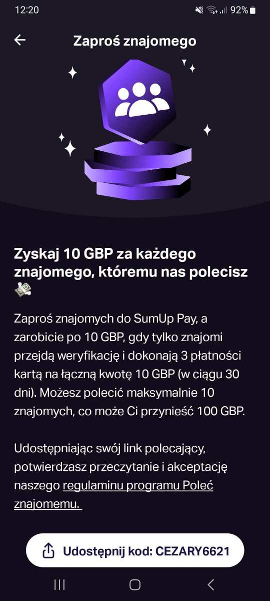 Info ! Kod wpisujemy dopiero po weryfikacji ! WYMAGANIA: połącz się przez VPN z UK rejestracja z podanego poniżej linku UWAGA WAŻNE !!! Po podaniu numeru telefonu i wprowadzeniu kodu SMS w pierwszym kroku, pojawi się kolejna strona z informacja na górze: Country of residence: zmieniamy z Polski na Wielka Brytania / United Kingdom wybieramy zamieszkanie: Wielka Brytania / United Kingdom podanie losowego adresu zamieszkania w UK tutaj wybierz adres: https://www.bestrandoms.com/random-address-in-uk weryfikacja KYC po pozytywnej weryfikacji wprowadzamy KOD POLECAJACY depozyt min. 11 GBP każde polecenie: 10 GBP Po pozytywnej weryfikacji należy zasilić konto kwotą min. 11 GBP. Następnie należy zrobić min. 3 transakcje na łączną kwotę min. 10 GBP kartą przypisaną do konta SumUp Pay, karta jest darmowa automatycznie dodana do konta po weryfikacji KYC. Kartę możemy dodać do portfela GPay albo ApplePay i od razu nią płacić. Bonus wpada automatycznie po wykonaniu powyższych czynności. Za każde polecenie również otrzymujemy 10 GBP, maksymalnie 10 osób czyli max. 100 GBP. Link do rejestracji: Otrzymaj 10 GBP po dołączeniu do SumUp Pay za pomocą mojego kodu: CEZARY6621. Pobierz aplikację już dziś i zyskaj cashback za każde zakupy kartą SumUp Pay Mastercard 💸 Link polecający: https://sumuppay.onelink.me/CXe5/friends Link czysty: https://www.sumup.com/en-gb/pay/download/ WAŻNE! Pamiętaj, aby podczas rejestracji wprowadzić KOD POLECENIA, inaczej nagroda nie zostanie naliczona do Twojego konta.