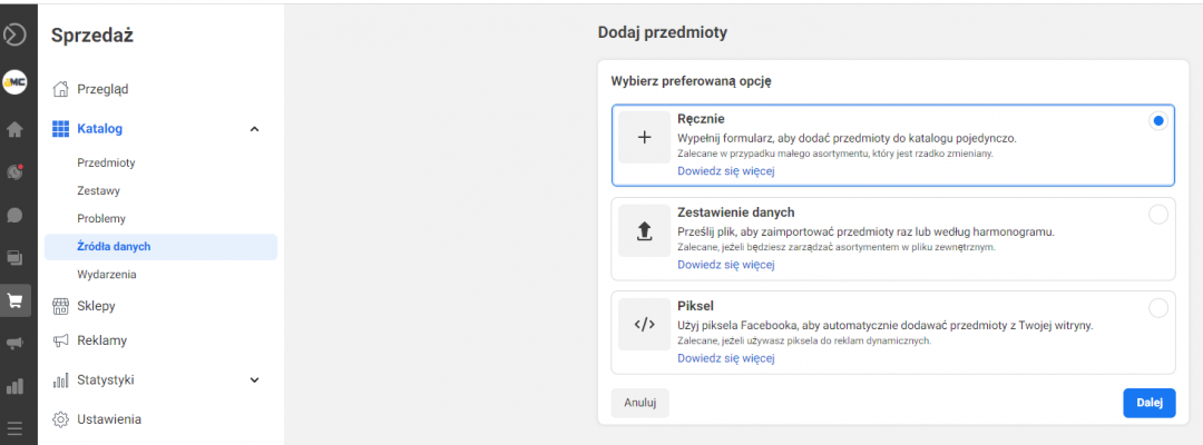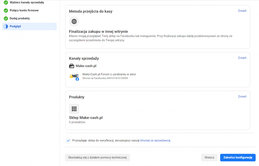 Sklep na Facebooku to funkcja dostępna dla wszystkich użytkowników od kilku lat. Nie każdy wie jak ją uruchomić i jak z niej korzystać, a może ona znacznie zwiększyć sprzedaż Twojego sklepu internetowego. Początkowo miała działać zupełnie inaczej, lecz finalnie została udostępniona w formie zakładki na fanpage'u. Warto więc stworzyć sklep na Facebooku i dodać przynajmniej kilka najpopularniejszych produktów. Dzięki niemu, Twoi klienci będą mogli zobaczyć bezpośrednio na Facebooku co oferujesz. Z poniższego artykułu dowiesz się, jak działa sklep na Facebooku, jak go założyć i jak dodawać do niego produkty. Artykuł został sporządzony w oparciu o najnowsza wersję menadżera biznesu na FB! Czy warto założyć sklep na FB? Facebook w Polsce jest jednym z najbardziej popularnych portali społecznościowych. Nic więc dziwnego, że coraz więcej firm przenosi kanały sprzedażowe na właśnie tą platformę. Sklep na Facebooku warto założyć przynajmniej z kilku powodów: Użytkownicy, widząc grafikę produktu, mogą od razu na nią kliknąć, przejść do sklepu i poznać na jego temat szczegóły. Założenie i prowadzenie sklepu na Facebooku jest całkowicie darmowe. Nie musisz zatrudniać specjalisty lub kupować gotowego szablonu. Nie istnieje limit ilości produktów. Możesz tworzyć kolekcje, dzięki czemu Twoje produkty są lepiej uporządkowane. Facebook udostępnia statystyki, dzięki którym wiesz, który produkt jest najbardziej popularny, który generuje najwięcej kliknięć lub sprzedaży. Działa zarówno na Facebooku jak i Instagramie. To tylko kilka zalet pokazujących, że prowadzenie sklepu na Facebooku niesie za sobą wyłącznie korzyści. Jeżeli prowadzisz sklep internetowy i chciałbyś zwiększyć swoją sprzedaż, koniecznie skorzystaj z tej funkcji Facebooka. Jak działają sklepy na Facebooku? Sklep na Facebooku, to tak naprawdę osobna zakładka na fanpage'u, dzięki której obserwujący mogą w dowolnej chwili z niej skorzystać i przejrzeć ofertę Twojego sklepu. Kiedy założysz sklep i dodasz do niego kilka produktów, będziesz mógł w dowolnym momencie oznaczać je pod postami, zdjęciami, postami, itp. Dzięki temu bez problemu będziesz mógł linkować do nich, nawet, gdy w treści posta nie ma widocznego linku. Funkcja sklepu internetowego na Facebooku zoptymalizowana jest pod urządzenia mobilne, warto więc skupić się na użytkownikach smartfonów i dodawać takie produkty, które naprawdę przyciągają uwagę. Wchodząc w zakładkę sklep, klienci otrzymują pełnoekranowy widok, w którym prezentowane są stworzone przez właściciela sklepu kolekcje i produkty. Dodając nowy produkt do sklepu, Twoi obserwujący zostaną o tym poinformowani powiadomieniem, które będzie zapraszało do skorzystania z oferty lub zapoznania się z najnowszymi produktami dostępnymi w sklepie. Jak założyć sklep na Facebooku? Sklep na Facebooku może założyć każdy, kto: posiada opublikowany fanpage na Facebooku posiada uprawnienia administratora w Menadżerze firmy na Facebooku prowadzi sklep internetowy z produktami, które mają być zsynchronizowane z ofertą na Facebooku 1. Żeby założyć sklep na Facebooku, należy przejść do zakładki Ustawienia na swoim fanpage'u, następnie w podmenu "Szablony i karty" i tam zaznaczyć "Sklep". Następnie w menu swojego fanpage wybrać odpowiednią zakładkę. 2. Na stronie, na którą zostaniemy przekierowani, należy następnie kliknąć Przejdź do menadżera sprzedaży i rozpocząć konfigurację sklepu. Tutaj znajdziesz bezpośredni link do konfiguratora. 3. Po prostej konfiguracji będziesz posiadał sklep na Facebooku, do którego możesz dodawać produkty i tworzyć katalogi. Zanim jednak do tego przejdziesz, przydałoby się, żeby Twój sklep był nieco bardziej widoczny na stronie głównej fanpage'a. W tym celu możesz przesunąć zakładkę Sklep na samą górę, dzięki czemu będzie on widoczny od razu po wejściu na Twoją stronę. Konfiguracja sklepu na Facebooku Konfiguracja sklepu nie jest skomplikowana. Tak naprawdę, cały sklep jest na tyle przejrzysty i prosty, że nie trzeba w nim nic zmieniać. To, co musisz zrobić, to zaakceptować regulamin handlowy. Jest to niezbędny krok, wymagany, aby przejść dalej. Drugą ważną sprawą, jest wybór tego, w jaki sposób będzie dochodziło do finalizacji zakupów. Dostępne są dwie opcje: odesłanie do sklepu lub landing page'a. przekierowanie do Messengera, gdzie klient może zadać więcej pytań lub zamówić produkt. Ten krok jest bardzo istotny, ponieważ po założeniu sklepu nie będziesz miał możliwości zmiany sposobu zamawiania. Jedyną opcją zmiany, jest usunięcie i stworzenie nowego sklepu. Zastanów się więc dobrze, zanim dokonasz tej decyzji. Dodawanie produktów we własnym sklepie na Facebooku Produkty w sklepie Facebook'owym możesz dodać na trzy sposoby: ręczny i automatyczny oraz poprzez pixel fb. Ręczny wiąże się z większą ilością pracy przy dużej ilości produktów, a automatyczny z niewielką wiedzą na temat tworzenia plików z produktami. To, którą opcję powinieneś wybrać, zależy od ilości produktów w Twoim sklepie i tego, czy chcesz sprzedawać je na Facebooku, czy w swoim sklepie internetowym. Następnie wybieramy kanał sprzedaży (czyli nasz Fanpage) oraz konto firmowe (możemy je po prostu tam założyć podając tylko nazwę i email). Dalej przechodzimy do dodawania produktów poprzez utworzenie katalogu. Facebook wyświetli nam przegląd wybranych przez nas opcji, wyświetli pole do akceptacji regulaminu i po przejściu dalej tę część konfiguracji mamy już z głowy. Aby sklep był aktywny musisz dodać swoje produkty. Ręczne dodawanie produktów do sklepu na Facebooku Jeżeli zdecydujesz się ręcznie dodawać produkty, będziesz miał do czynienia z poniższym oknem, w którym wszystkie pola muszą być uzupełnione. Nazwa produktu może m