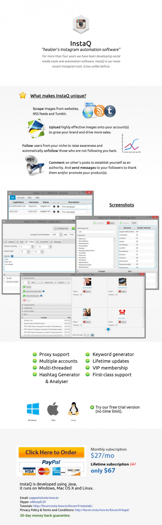 1. Nazwa przedmiotu: InstaQ - Narzędzie automatyzujące pracę z Instagramem 2. Opis przedmiotu: Główne funkcje: Podstawa, tj.: Scrapowanie zdjęć z dowolnej strony WWW, RSS lub Tumblr Wrzucanie postów na Instagram Komentowanie wpisów Follow & unfollow osób, którzy Ciebie nie śledzą Wysyłanie wiadomości Inteligentny system unikania blokad kont Tryb ręczny / autopilot Obsługa proxy Obsługa wielu kont jednocześnie Praca wielowątkowa Generator hashtagów & narzędzie do analizy zyskowności hashtagów Generator słów kluczowych Dożywotnie aktualizacje Członkostwo VIP na forum (profesjonalny support + bonusowe materiały, np. poradniki) Szybki i profesjonalny support + średnio co kilka dni dodawane są nowe, autorskie funkcjonalności 3. Źródło pozyskania: - 4. Zdjęcia: - 5. Kontakt: wiktorpl220 (skype) | PW 6. Cena: 97$ 67$ - Dożywotnio (płatność jednorazowa) | 27$ - Miesięcznie (płatność miesięczna) 7. Sposób zapłaty: PayPal | Visa | Mastercard | American Express Card | Discover Network ZAKUP INSTAQ TUTAJ - https://insta-how.to/InstaQ/ WYPRÓBUJ ZA DARMO - http://forum.insta-how.to/topic/6-instaq-official-download-trial/ WAŻNE! Cena promocyjna (67$ zamiast 97$) obowiązuje jedynie przez parę dni! W razie niejasności lub pytań proszę uderzać na PW lub skype
