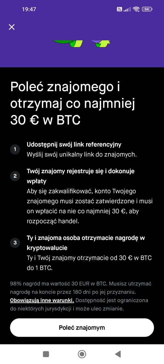 Robinhood Bonus min. 30€ + 50% mojego bonusu wypłacane od razu 1️⃣ Rejestracja z mojego linku oraz wykonanie pełnego KYC 2️⃣ Wpłać minimum 30€ i dokonaj zakupu jakiejkolwiek crypto. Możesz je od razu sprzedać 3️⃣ Bonus za wykonanie trade czyli tytułowe 30€ (to nagroda minimalna ale możesz trafić więcej) bedzie możliwy do wypłaty po 180 dniach Data zakończenia nie jest znana dlatego pisz PW jeśli chcesz reff link (sprawdzam aktualność promki przed wysyłką aby nikt się nie naciął) Dodatkowo istnieje możliwośc zarobienia kilku € za quizy 🔥Środki za które kupisz crypto na potrzeby promocji możesz wypłacić od razu wraz z nagrodą za quiz (+ moim refkiem) Czysty link: https://robinhood.com/eu/en/about/crypto/ Reff: PISZ PW 💬 Zysk natychmiastowy to co najmniej 24€ + niestety zamrożony bonus min. 30€ na 180 dni