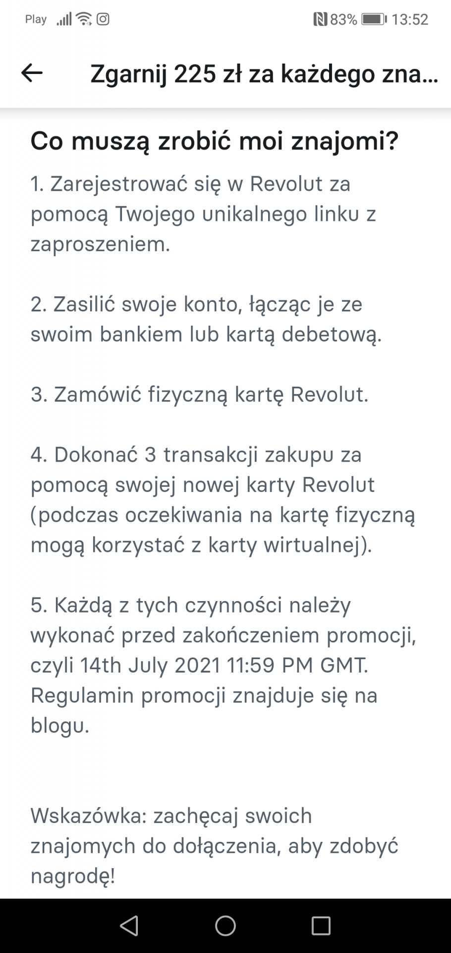 1. Oczekuje: Założenia konta Revolut 2. W zamian: 175 zł dla Ciebie! 3. Czas oddania przysługi: Odrazu po przyznanym bonusie za Twoją rejestrację. 4. Data zakończenia: 14.07.2021 5. Kontakt: Pw 6. Opis: Żeby bonus został przyznany trzeba wykonać poniższe czynności, można zrobić to bardzo szybko wszystko odbywa się online.- 2 odpowiedzi