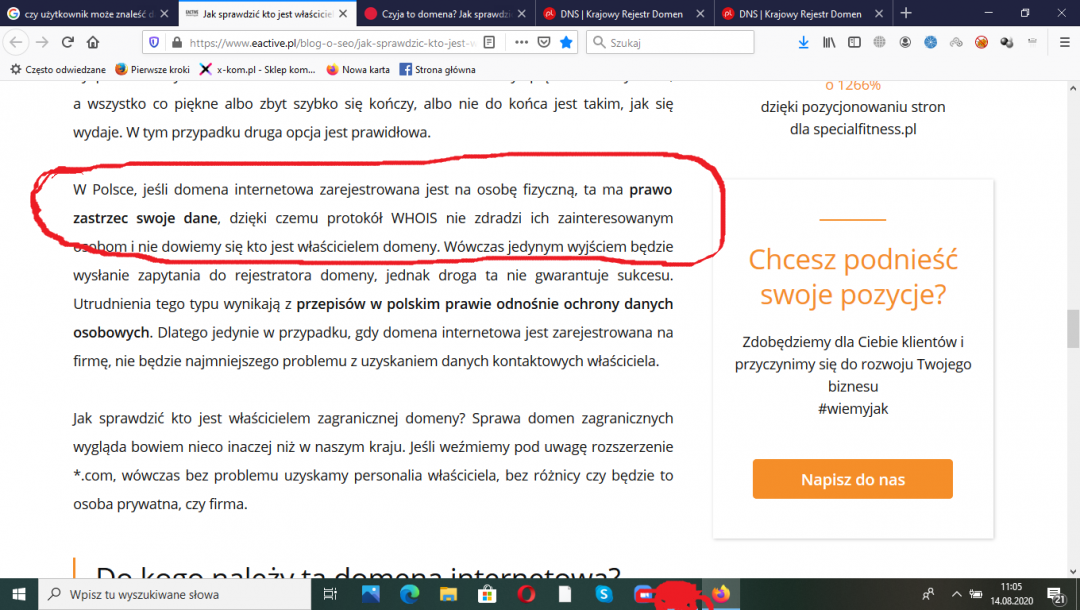 Witajcie Od pewnego czasu chodzi mi jedna rzecz po głowie : Jak to wygląda z bazą WHOIS (sprawdzenie kto jest właścicielem domeny) mam 1 projekt na którym mi zależy aby nie było możliwości sprawdzenia że należy do mnie. Czytałem na ten temat wiele artykułów jednak nadal mam pewne wątpliwości jak to zrobić Głównie opierałem się na tym materiale : https://www.eactive.pl/blog-o-seo/jak-sprawdzic-kto-jest-wlascicielem-domeny-internetowej/ W artykule jest napisane że istnieje możliwość zastrzeżenia danych właściciela domeny w WHOIS jednak nie pisze jak to zrobić Czy ktoś z Was wie coś więcej na ten temat aby mieć domenę full anonimowo na 200 % i może odnieść się do tego wpisu ? W załączniku podsyłam wyżej opisany fragment