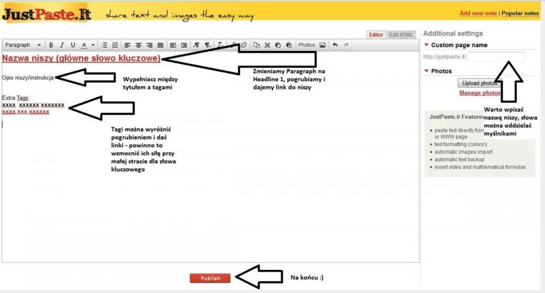 Chciałbym przedstawić Wam kolejny serwis, w którym można promować swoje nisze Oczywiście nie używamy swojego IP tylko wchodzimy przez TOR, ADVOR, hidemyboobs( ) itp. Krótki poradnik: 1. Wchodzimy na stronkę http://justpaste.it/ 2. Wypełniamy jak na poniższym załączniku. 3. Cieszymy się linkami DoFollow z PR 5. EDIT: Chciałbym jeszcze dodać, że w prawym górnym rogu możemy przełączyć sobie widok na HTML i skopiować do edytora tekstowego, w którym można szybciej przygotować wklejki z wcześniej utworzonego szablonu. Pozdrawiam i życzę rozważnego promowania