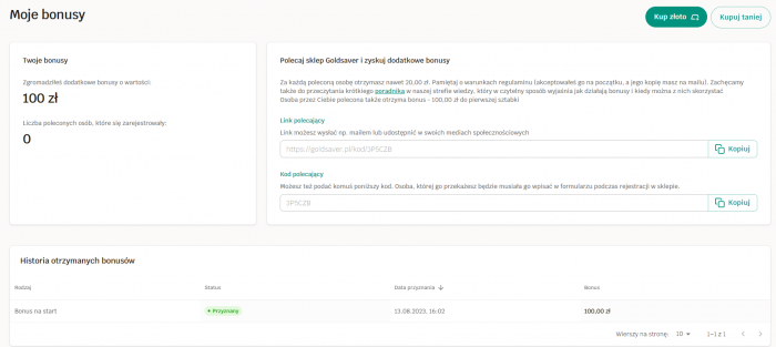 Goldsaver.pl - inwestycja w złoto Goldsaver jest częścią Goldenmark. Od lat dostarcza fizyczne złoto - sztabki i monety. Jest jednym z największych w Polsce dystrybutorem złota fizycznego na rynku klientów indywidualnych. Strona pozwala na inwestycję od 50 do 5000zł miesięcznie, a przy zebraniu 1 uncji złota, można odebrać sztabkę w wybranej placówce, otrzymać kurierem, lub odsprzedać w tym, lub w dowolnym kantorze skupującym złoto. Zakładając konto z reflinka osoba polecająca otrzymuje 20zł, a osoba polecona na start 100zł Jest to serwis do inwestycji na długi dystans, otrzymanego bonusu nie można wypłacić wcześniej, niż po uzbieraniu 1 Uncji złota (31,1g) Sam skorzystałem, bonus przypisany natychmiastowo i będę co miesiąc, (może częściej) wpłacał na własną sztabkę. Czysty: https://goldsaver.pl Reflink: https://goldsaver.pl/kod/3P5CZB