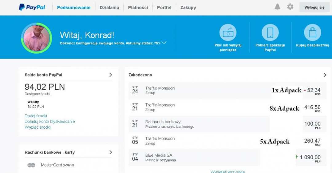 Serdecznie witam forumowiczów, jak również osoby odwiedzające forum. Mam na imię Konrad i postanowiłem zacząć "monitorować" swoje postępy w Trafficmonsoon - dla tych którzy nie wiedzą jest to firma znana ze skutecznej reklamy. Założenie jej istnienia to - reklamuj swój biznes i na tym zarabiaj. Oferuje 4 możliwości zarabiania: - klikanie w płatne reklamy tzw. cashlinks pozwalające wyklikać dziennie kilkadziesiąc centów (Jeżeli mamy osobę poleconą to zarabiamy 100% prowizji, którą ona wyklika) - zysk pośredni, dzięki reklamie możemy zarabiać na innych stronach, jeżeli reklamujesz swój produkt lub usługę, to zwyczajnie dzięki reklamie więcej osób zaczyna z niego korzystać co przekłada się na większy zysk - zakup AdPack – najlepszy sposób zarabiania, dzięki któremu otrzymujemy również możliwość reklamowania. Firma dzieli się swoimi zyskami z osobami, które kupiły Adpacki, za zakup jednego Adpacka otrzymujesz 1000 wyświetleń swojej strony oraz 20 kliknięć w swój baner. - zyski z prowizji poleconych, otrzymujemy 10% za każdy zakup poleconego, przykładowo Twój znajomy kupuje Adpacka za 50$, Ty otrzymujesz za to 5$, a jeżeli on zarobione pieniądze reinwestuje (kupuje ciągle nowe Adpacki) Ty ciągle otrzymujesz prowizję. Zacząłem od inwestycji około 1100zł - kupno 5 Adpack. 16 dni później dokupiłem kolejne 8 paczek, a za kolejne 3 dni jeszcze jedną. (Patrz obraz numer 1) Firma Trafficmonsoon jest firmą typu revenue share - czyli dzielącą się z użytkownikami posiadającymi wykupione tzw. paczki (Adpacki) swoimi zyskami. Przypomnę jak działa taki Adpack. Kupiony przez nas za 50$, "zarabia" codziennie po 1$ przez około 55 dni, więc zarabiamy z niego w sumie 55$ (55$ - 50$ = 5$ na czysto) Ja się skupiam na strategii polegającej na ciągłej reinwestycji - czyli zarobionych pieniędzy nie wypłacam, tylko zakupuje kolejne paczki, zwiększając ich liczbę. W ten sposób chcę osiągnąć swój pierwszy cel - 100 aktywnych Adpacków. Następnie mam zamiar wypłacać codzienny zysk a resztę reinwestować w stosunku 10/90 % bądź 20/80 % aż odzyskam swój kapitał, który zainwestowałem, jednocześnie utrzymując liczbę Adpacków zbliżoną do 100. Taki procent składany jest w stanie wg mnie i nie tylko pozwolić odzyskać zainwestowany kapitał po kilku miesiącach i cieszyć się zabawą bez ryzyka - wszystko zależy od inwestycji. W późniejszym etapie mam zamiar zacząć budowanie swojego zespołu, co również mam zamiar tutaj opisywać. Na ten moment mój wynik prezentuje się następująco - zarobione w sumie 161$ przeznaczone na ciągłą reinwestycję. Obecna liczba Adpacków 17 - oznacza 17$ przychodu na dobę, pozwalająca na zakup kolejnego Adpacka co 3 dni (drugi obrazek)- 42 odpowiedzi