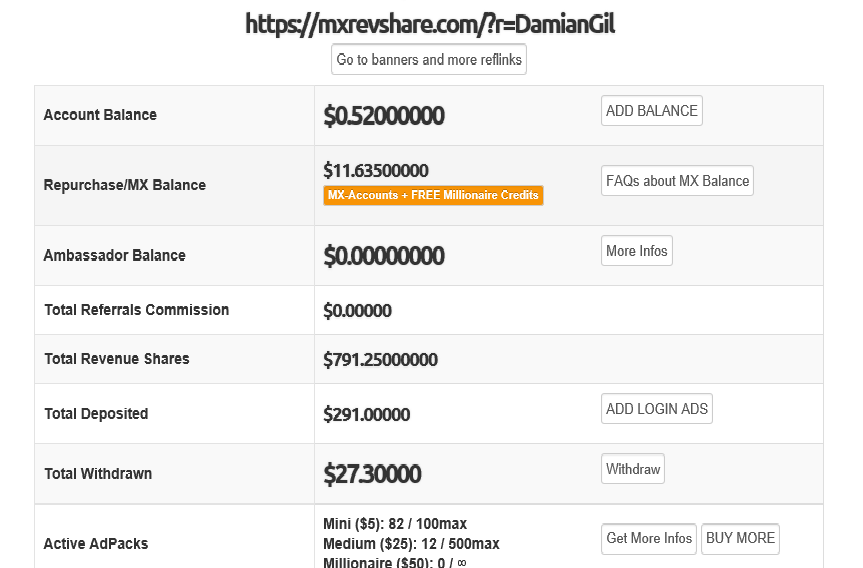 Witam W programie MXRevShare działam od 3 miesięcy. Przez pierwsze 3 tygodnie z dość dużym dystansem spoglądałem na ten program i klikałem wyłącznie 100 reklam dziennie bez inwestycji i po 10 dniach kupiłem 1 paczkę. Następnie idąc z zasadą "Kto nie ryzykuje szampana nie pije" zainwestowałem 1200 zł. Ostatnio wykonałem swoją pierwszą wypłatę próbną wypłatę 100zł, czekałem 12h i kasa była na koncie Kolejną wypłatę planuje wykonać pod koniec września, bo wybieram się na wakacje Jeżeli ktoś chciał się zarejestrować zapraszam serdecznie: https://mxrevshare.com/?r=DamianGil Sytuacja na dzień dzisiejszy wygląda następująco :