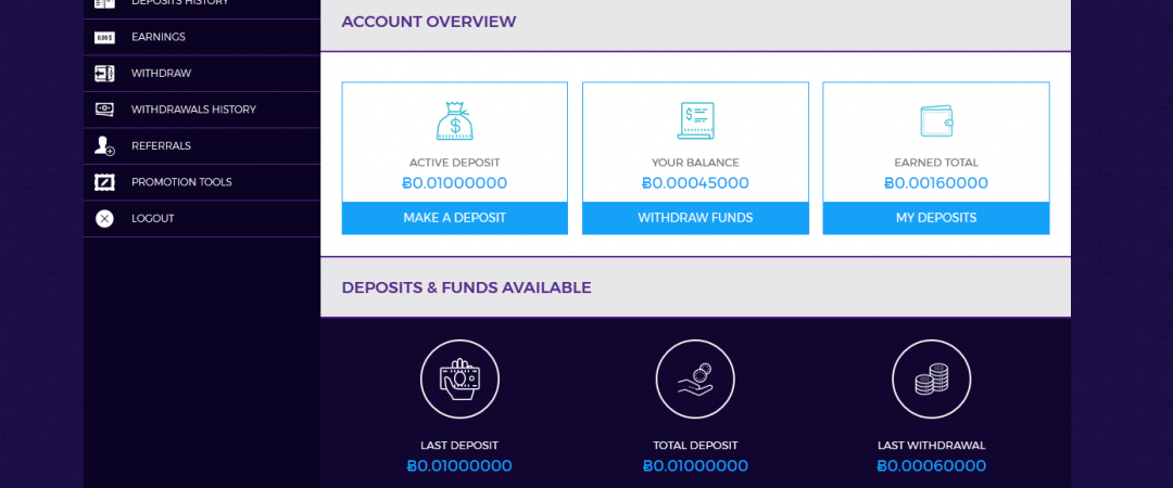Nazwa programy: free mining btc Start programu: 2017-07-14 System płatności: Bitcoin Model inwestowania: Możemy tu kupić 4 rodzaje paczek, a za samą rejestracje mamy dziennie 0.0005BTC. Free- 0.0005BTC dziennie STARTER - Koszt 0.01BTC, 0.0007BTC dziennie5% PREMIUM – Koszt 0.2BTC, 0.017BTC dziennie8,5% GOLDEN – Koszt 0.5BTC, 0.05BTC dziennie10% VIP – Koszt 1BTC, 0.2BTC dziennie20% Minimalna wypłata: 0.005BTC Wypłaty: Instant System płatniczy: Bitcoin Za poleconych: 25% Komentarz: Strona raczej nie jest piękna, ale prosta i przejrzysta. Daje rzekomy szybki zwrot, duży zysk no i darmowy bonus na start. Fakt, że można zacząć działać w programie za darmo sprawia, że nie da się przejść obok programu obojętnie. Ja osobiście bazuję na darmowym bonusie. Link z moim refem: https://freeminingbtc.com/?ref=103180 Tu czysty link: https://freeminingbtc.com -