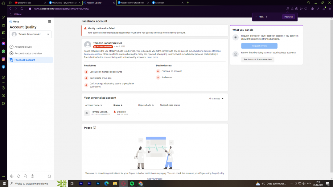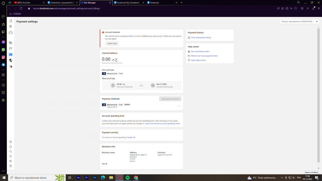 Witam mam taki problem jak na screenach poniżej. Ktoś włamał się na moje konto rok temu. Myślałem, że wszystko jest ok. Odzyskałem hasło i nie widziałem żadnego problemu. Jednak ostatnio okazało się, że mam założone konto reklamowe, a nigdy go nie zakładałem. Konto jest ograniczone, przez co np. nie wyświetlają mi się proponowani znajomi. Dodatkowo do konta podpięta jest jakaś firma, karta kredytowa oraz waluta zmieniona jest na egipską. Ma ktoś pomysł jak to usunąć lub odwołać się od decyzji? Wydaje mi się, że przeszukałem wszystkie opcje i nie widzę czegoś takiego.