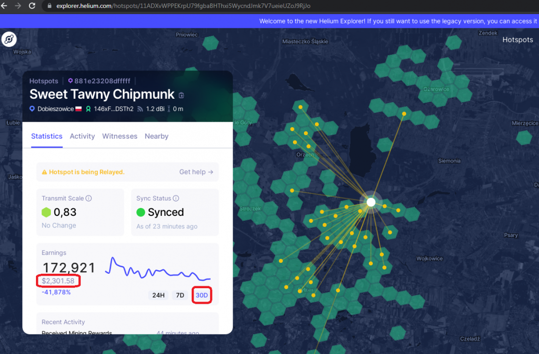 Nie, bo to działa na zasadzie nadajnika/odbiornika radiowego. Zasada polega na łączeniu w sieć hotspotów oddalonych od siebie o min. 300 metrów. Im wyżej i im mniej przeszkód (budynki, drzewa, itp.) tym lepszy zasięg hotspota. Na standardowych antenach, przy dobrej lokalizacji zasięg może dochodzić do kilku kilometrów. Na niestandardowych, mocniejszych antenach nawet kilkadziesiąt - chociaż widziałem jak spot się łączył z Lublina w okolice Rzeszowa. Ogólnie cała idea polega na tworzeniu sieci IoT (internet of things), z którego korzystają smart urządzenia, typu lokalizatory (np. do kluczy, dla psów), jakieś smartbandy, urządzenia w smart domach, itp. Nasz hotspot zarabia, kiedy jakieś urządzenie "skorzysta" z naszej sieci. Ogólnie im więcej mamy połączonych ze sobą spotów, tym większy będzie zarobek (pod warunkiem, że są oddalone min, 300m od siebie). Tutaj jest aktualna mapa spotów, można również podejrzeć zarobki (dzienne, 7-dniowe, 30-dniowe) : https://explorer.helium.com/ Co do zarobków, widziałem spoty zarabiające ponad 1000$ miesięcznie. Także przy kilku w dobrym położeniu można sporo wyciągnąć. Liczba spotów się systematycznie zwiększa - na miesiąc jest przeznaczone 2.5 miliona HNT (do 1 sierpnia 2021 było to 5 milionów) tokenów jako nagrody dla górników (nagrody w głównej mierze zależą, jak wcześniej wspominałem, od urządzeń łączących się z naszą siecią). Spoty w tym momencie jest okrutnie ciężko kupić - trzeba polować. 1 spot to koszt ok. 2300-2500zł z dystrybucji, choć na prywatnych aukcjach dochodzą do ponad 10k zł za szt. - ale wtedy mamy 100% zarobków dla siebie. Jeden hotspot, gdzie w pobliżu nie ma innych (mała szansa na połączenie z innymi spotami) się kompletnie nie opłaca - nie zarabia praktycznie nic. To tak w dużym uproszczeniu PS. na szybko znaleziony hotspot na Górnym Śląsku - zarobki z ostatnich 30 dni - 2300$