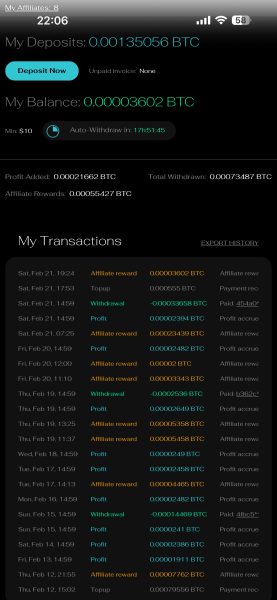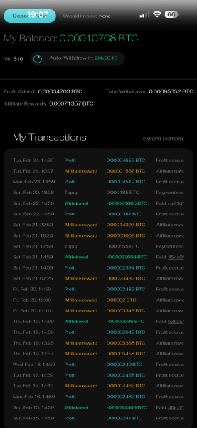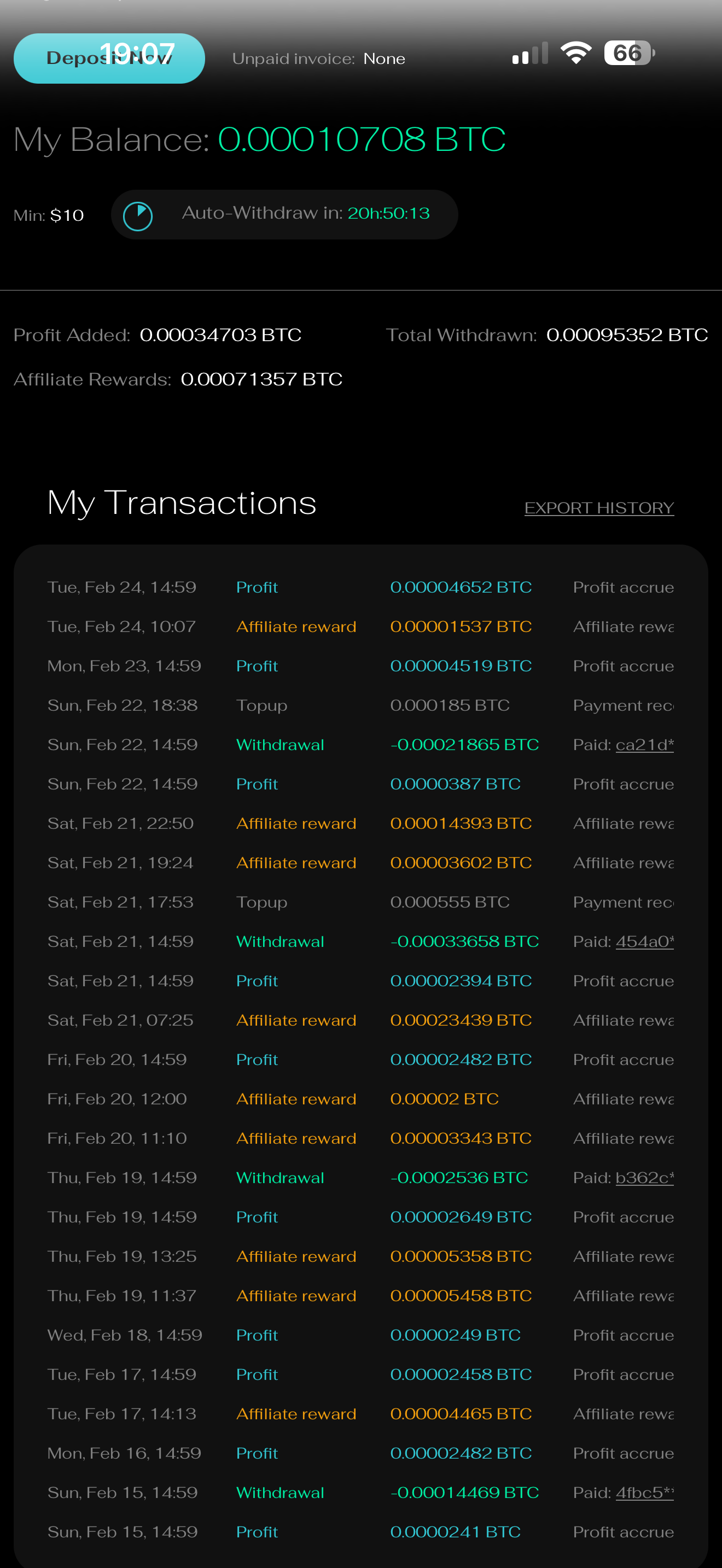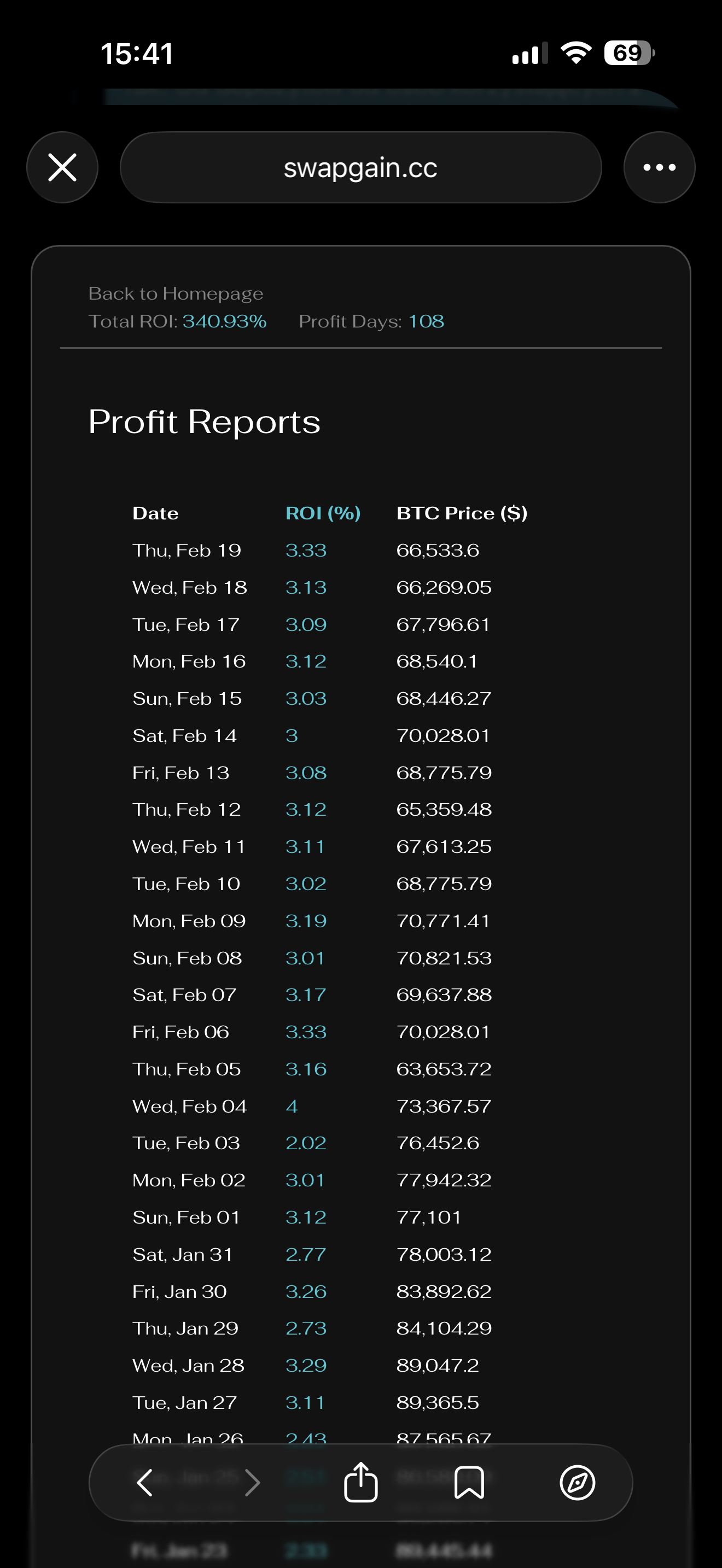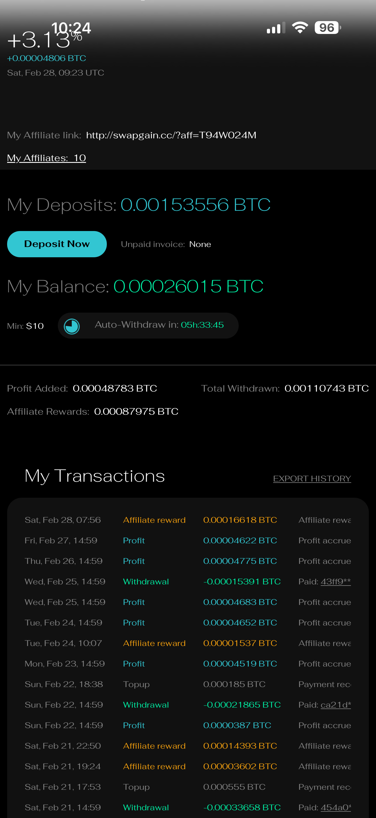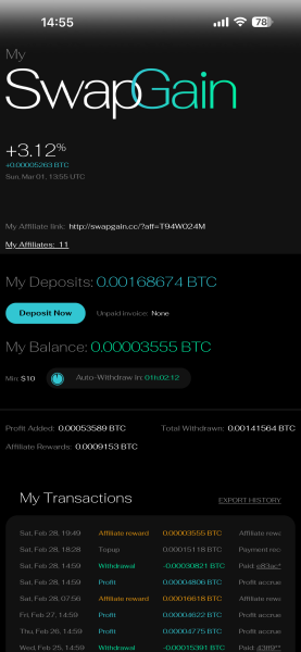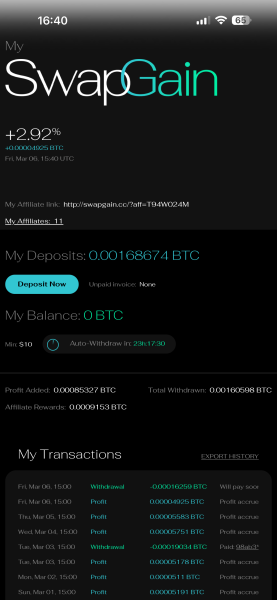Witam Daje wam fajna apke, jestem w niej od 12 lutego, osoba ktora mnie zaprosila jest od 29 stycznia, bardzo fajna apka, mi wyplaty przychodza miedzy 19-20 Kilka trickow wam zdradze odnosnie tej apki, najlepiej jest wejsc w apke do godziny 15, na chwile obecna automatyczna wyplata dziala codziennie o 16, jak widzicie mi sie udalo tak wejsc ze moj profit jest dodawany przed auto wyplata ale jak zmienia czas to juz nie bede tak mial. Pierwszy depozyt opisalem ile jest minimum ale kolejny depozyt mozecie nawet doplacic dolara czy dwa, ja tak doplacam sobie po troszku, pod spodem jest pelny opis wraz z linkiem referencyjnym i czystym linkiem. Udostepnie kilka screenshotow, jesli potrzebujecie jakichs informacji moj telegram @Volerix Bylem w bardzo duzo hyipow, w wiekszosci zarobilem ale byly tez hyipy co lekko stracilem, najwazniejsze to jest zainwestowac tyle ile mozecie sobie na to pozwolic, a podstawa jest odrobic wklad wlasny, dlatego wszedlem w tego hyipa bo wg.mnie okres probny przezyl, mozemy cos podzialac tutaj, wszystkie te nowe hyipy to ledwo dwa tygodnie zyja i padaja jak muchy SwapGain Czysty Link http://swapgain.cc Ref Link http://swapgain.cc/?aff=T94W024M Zautomatyzowany system wymiany SwapGain AI działa 24/7 na setkach rynków kryptowalut. Analizuje ceny i wolumeny, wyszukuje krótkoterminowe okazje i automatycznie realizuje transakcje. System wykorzystuje również kapitał lewarowany do generowania zysków na rynkach finansowych. W praktyce: Wpłać co najmniej 0,0004422 BTC (~30 USD) Zarabiaj do 4% dziennie Kapitał nie ma terminu ważności Wypłaty są automatycznie deponowane w Twoim portfelu BTC Nie musisz handlować ręcznie Nagrody za polecenie: 10 - 2 - 1 10% poziomu pierwszego. 2% Poziom Drugi 1% Poziom Trzeci Nagrody zostaną dodane do Twojego konta po potwierdzeniu transakcji. Rejestracja (tylko adres BTC, bez formularzy): http://swapgain.cc/?aff=T94W024M Na górze wpisz swój portfel BTC (wraz z podsiecią BTC) i kliknij Start. FAQ - Najczęściej zadawane pytania 1. Czy muszę się zarejestrować? Nie. Wystarczy wpisać adres portfela BTC. 2. Od jakiej kwoty mogę zacząć? 0,0004422 BTC, około 30 USD 3. Czy gwarantowany jest dzienny zysk w wysokości 4%? Nie. Jest to maksymalny deklarowany wynik; rzeczywiste zyski mogą się różnić. 4. Kiedy realizowane są wypłaty? Raz dziennie, automatycznie do Twojego portfela BTC. 5. Minimalna wypłata? 10 USD. 6. Czy mogę doładować konto później? Tak, możesz zwiększyć swój depozyt w dowolnym momencie. 7. Czy mogę mieć więcej niż jedno konto? Nie. Jedna osoba może mieć jeden adres BTC. 8. Czy istnieje program poleceń? Tak. Od depozytów od osób korzystających z Twojego linku pobierana jest prowizja w wysokości 10%. 9. Czy muszę przejść proces KYC? Nie. Platforma nie wymaga weryfikacji tożsamości. 10. Czy mogę wypłacić swój początkowy depozyt? Nie, kapitał początkowy jest wliczony w Twoje płatności, ponieważ wszystkie doładowania są dożywotnie. Zyski są automatycznie wypłacane co 24 godziny na Twój portfel (min. 10,00 USD). 11. Gdzie znajdują się warunki i pełna wersja FAQ? https://swapgain.cc/faq Mam nadzieje ze ten czysty link jest dobry bo wpisywalem go po prostu recznie -