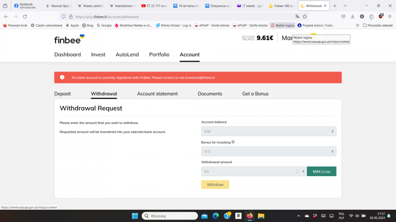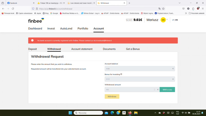 Ja mam problem z wypłatą. Najpierw 5 euro dostałem za samą rejestrację, zainwestowałem je w jakąś pożyczkę. Gdy 5 euro do mnie wróciłem, zainwestowałem je ponownie w inną pożyczkę. Sprzedałem obie na rynku wtórnym ze stratą 5% czyli mam teraz w pozycji Account Balance 9,61 euro. Nie mogę tego wypłacić, a nie mam na wpłatę na depozyt. Teraz pytanie, jak ten bonus mogę wypłacić. Wychodzi na to, że mógłbym wypłacić, gdybym miał swoje konto Finbee powiązane z rachunkiem bankowym. Może muszę teraz te 9.61 euro zainwestować w kolejną pożyczkę, albo jest jakiś sposób wypłaty na kartę? Ktoś zna odpowiedź? -