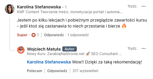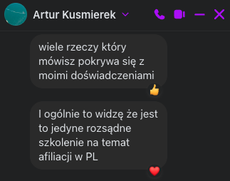 @Paweł Wyniki kursantów będą się pojawiać z czasem - to świeży projekt. Po drugie, kurs kupują właśnie ci, którzy chcą zdobyć kompetencje, a nie ci, którzy już mają doświadczenie na poziomie eksperta. To tak, jakby krytykować szkołę, że uczniowie nie mają jeszcze dyplomu w pierwszym tygodniu zajęć. @SPHCC Też widziałem dziesiątki "martwych" community. Ja sam publikuję tam aktualizacje z budowy mojej nowej strony afiliacyjnej (building in public), więc uczestnicy widzą dokładnie, jak rozwijam projekt krok po kroku. @cancer Nie, to nie są "koledzy z branży", którym coś obiecałem w zamian za opinię. Opinie są od osób, których wcześniej nie znałem osobiście - po prostu działają w afiliacji i monetyzacji portali od lat, więc wiedzą, o czym mówią. Zależało mi właśnie na tym, żeby to były niezależne głosy ludzi z doświadczeniem, a nie znajomi, którzy napiszą cokolwiek na zasadzie przysługi. Dlatego każdą z tych osób można sprawdzić po imieniu i nazwisku na LinkedIn czy Facebooku - wszystko jest transparentne. Ogólnie naprawdę szanuję różne opinie - ale z takim nastawieniem trudno cokolwiek w tej branży osiągnąć. Ludzie, których znam i którzy faktycznie robią wyniki, podchodzą do nowych rzeczy z ciekawością, a nie z podejrzeniem. Testują, sprawdzają, wyciągają wnioski - bo wiedzą, że właśnie tak zdobywa się doświadczenie i przewagę. Sam kupuję różne produkty i szkolenia, żeby znaleźć nowe spojrzenia, procesy czy metody, które mogę później wdrożyć u siebie. A tutaj widzę głównie narzekanie i szukanie dziury w całym - słaby vibe, zupełnie nie ten mindset, który prowadzi do wyników. PS. Do szkolenia dołączyło już ponad 30 osób. Zostały ostatnie dni przedsprzedaży - potem cena idzie w górę o 500PLN. 5% rabatu tylko dla użytkowników forum - kod: MAKECASH5 👉 Kup z rabatem tutaj