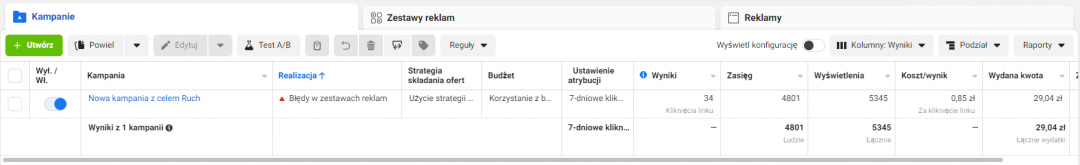 Na koncie jeszcze raz mogę puścić reklamę na innym fanpage po czym znów dzieje się dokładnie to samo co powyżej.